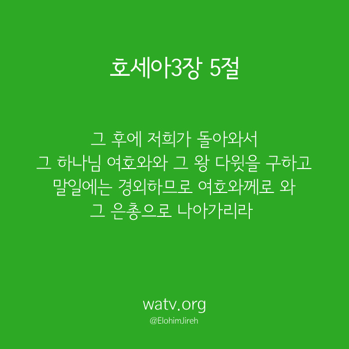 | 호세아 3장 5절 그 후에 저희가 돌아와서 그 하나님 여호와와 그 왕 ②다윗을 구하고 ①말일에는 경외하므로 여호와께로 와 그 은총으로 나아가리라 |