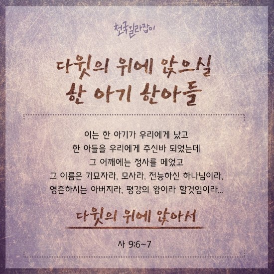 | 이사야 9장 6~7절 이는 한 아기가 우리에게 났고 한 아들을 우리에게 주신바 되었는데 그 어깨에는 정사를 메었고 그 이름은 기묘자라, 모사라, 전능하신 하나님이라, 영존하시는 아버지라, 평강의 왕이라 할것임이라 그 정사와 평강의 더함이 무궁하며 또 ①다윗의 위에 앉아서 그 나라를 굳게 세우고 자금 이후 영원토록 공평과 정의로 그것을 보존하실 것이라 만군의 여호와의 열심이 이를 이루시리라 |