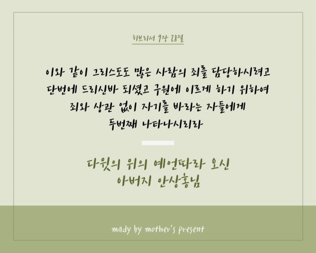 | 히브리서 9장 28절 이와 같이 그리스도도 많은 사람의 죄를 담당하시려고 단번에 드리신바 되셨고 구원에 이르게 하기 위하여 죄와 상관 없이 자기를 바라는 자들에게 ①두번째 나타나시리라 |