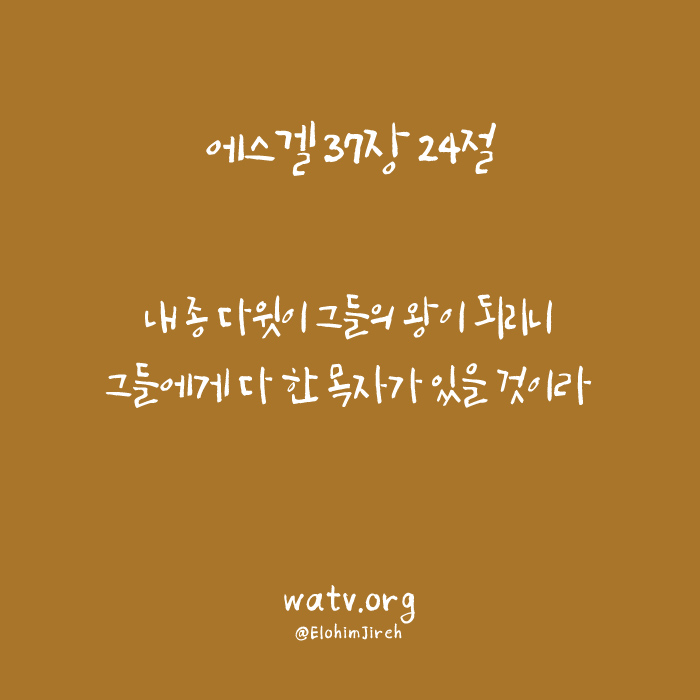 | 에스겔 37장 24~25절 내 종 ①다윗이 그들의 왕이 되리니 그들에게 다 한 목자가 있을 것이라 그들이 내 규례를 준행하고 내 율례를 지켜 행하며 내가 내 종 야곱에게 준 땅 곧 그 열조가 거하던 땅에 그들이 거하되 그들과 그 자자 손손이 영원히 거기 거할 것이요 내 종 다윗이 영원히 그 왕이 되리라 내가 그들과 화평의 언약을 세워서 영원한 언약이 되게 하고 |