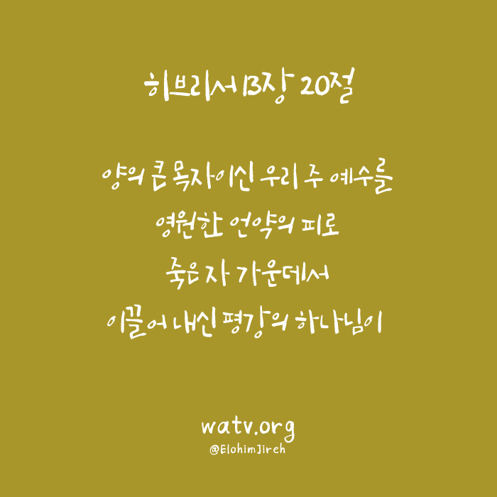 | 히브리서 13장 20절 양의 큰 목자이신 우리 주 예수를 ①영원한 언약의 피로 죽은 자 가운데서 이끌어 내신 평강의 하나님이 |