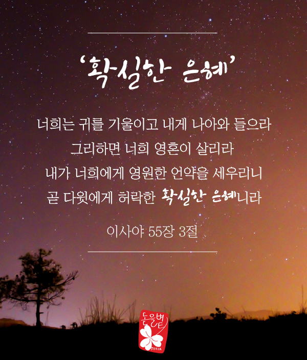 | 이사야 55장 3절 너희는 귀를 기울이고 ①내게 나아와 들으라 그리하면 너희 영혼이 살리라 ②내가 너희에게 영원한 언약을 세우리니 곧 ③다윗에게 허락한 확실한 은혜니라 |