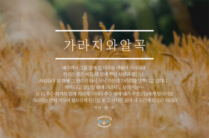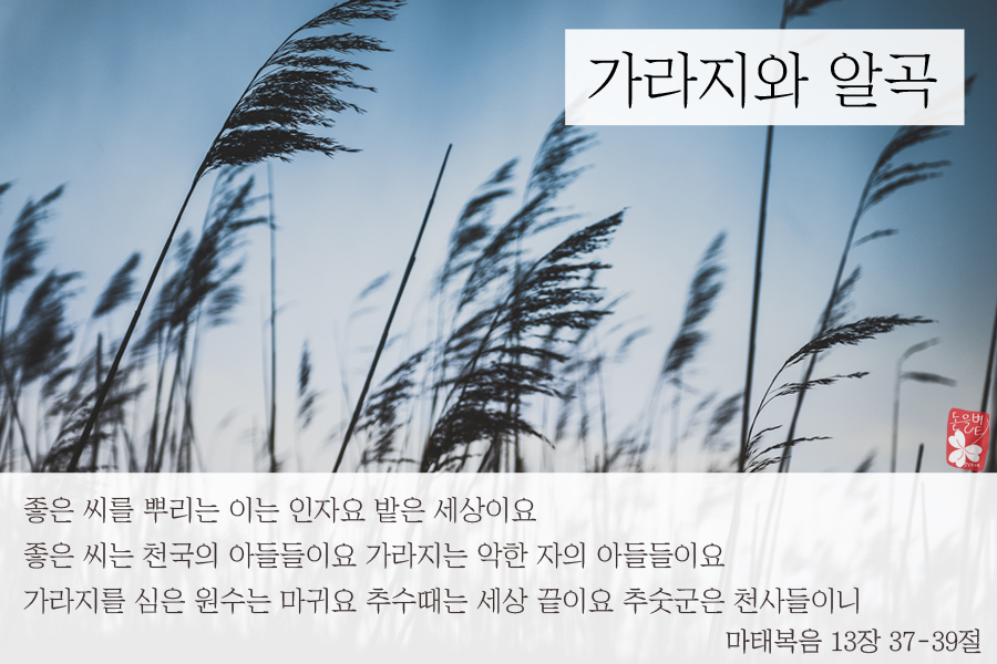 마태복음 13:24~30 천국은 ①좋은 씨를 제 밭에 뿌린 사람과 같으니 사람들이 잘 때에 그 ②원수가 와서 곡식 가운데 ③가라지를 덧뿌리고 갔더니 싹이 나고 결실할 때에 가라지도 보이거늘 집주인의 종들이 와서 말하되 주여 밭에 좋은 씨를 심지 아니하였나이까 그러면 가라지가 어디서 생겼나이까 주인이 가로되 원수가 이렇게 하였구나 종들이 말하되 그러면 우리가 가서 이것을 뽑기를 원하시나이까 주인이 가로되 가만 두어라 가라지를 뽑다가 곡식까지 뽑을까 염려하노라 둘 다 ④추수 때까지 함께 자라게 두어라 추수 때에 내가 추수꾼들에게 말하기를 가라지는 먼저 거두어 ⑤불사르게 단으로 묶고 곡식은 모아 내 곳간에 넣으라 하리라