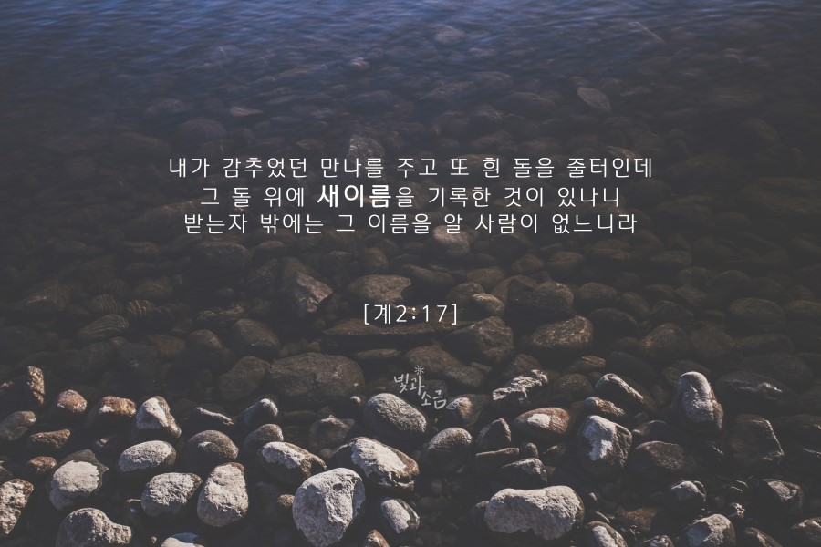 요한계시록 2장 17절 귀 있는 자는 성령이 교회들에게 하시는 말씀을 들을찌어다 이기는 그에게는 내가 감추었던 만나를 주고 또 ①흰 돌을 줄터인데 그 ②돌 위에 새 이름을 기록한 것이 있나니 ③받는 자 밖에는 그 이름을 알 사람이 없느니라