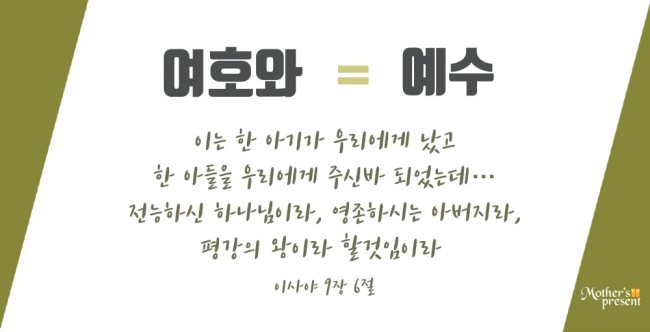 이사야 9장 6절 이는 ①한 아기가 우리에게 났고 한 아들을 우리에게 주신바 되었는데 그 어깨에는 정사를 메었고 그 이름은 기묘자라, 모사라, ②전능하신 하나님이라, 영존하시는 아버지라, 평강의 왕이라 할것임이라