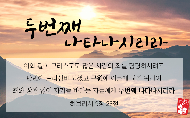 히브리서 9장 28절 이와 같이 그리스도도 많은 사람의 죄를 담당하시려고 단번에 드리신바 되셨고 구원에 이르게 하기 위하여 죄와 상관 없이 자기를 바라는 자들에게 ①두번째 나타나시리라