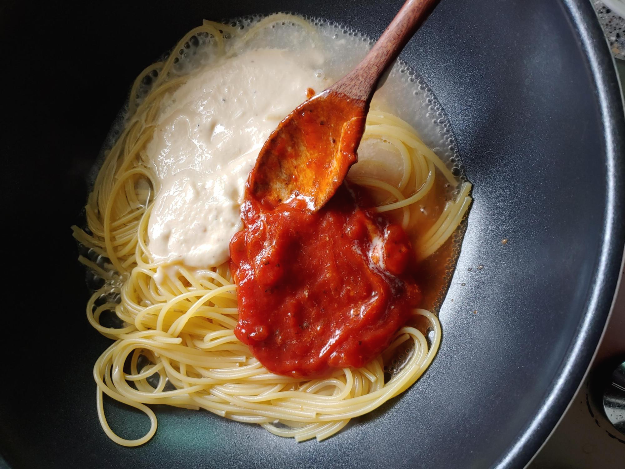 5. 여기에 토마토소스를 적당량 넣습니다.(저는 토마토 소스가 1/2인분 남아서, 통에 남은 전부를 넣었습니다. 토마토소스가 부족했기에, 크림소스를 같이 넣어 요리하는 로제파스타로 결정했죠)