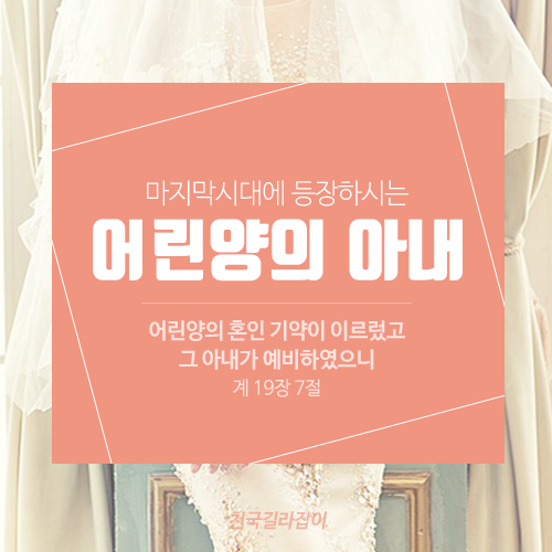 요한계시록 19장 7~9절 우리가 즐거워하고 크게 기뻐하여 그에게 영광을 돌리세 ①어린 양의 ②혼인 기약이 이르렀고 그 ③아내가 예비하였으니 그에게 허락하사 빛나고 깨끗한 세마포를 입게 하셨은즉 이 세마포는 성도들의 옳은 행실이라도 하더라 천사가 내게 말하기를 기록하라 어린 양의 혼인 잔치에 ④청함을 입은 자들이 복이 있도다 하고