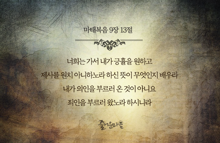 마태복음 9장 13절 너희는 가서 내가 긍휼을 원하고 제사를 원치 아니하노라 하신 뜻이 무엇인지 배우라 ①내가 의인을 부르러 온 것이 아니요 ②죄인을 부르러 왔노라 하시니라