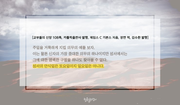 | 억만인의 신앙 200쪽, 가톨릭출판사 나는 성서를 창세기 첫 장부터 묵시록 끝 장까지 다 읽어 보았지만 ①주일을 거룩히 지내라는 구절은 발견하지 못했다. 성서에 기록되어 있기는, ②한 주일의 첫날인 일요일을 지키라 하지 않고 마지막 날인 토요일을 지키라고 되어 있다. |
