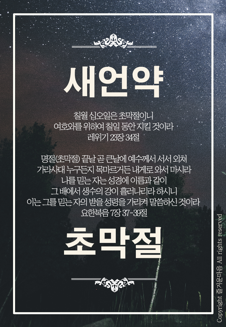 레위기 23장 34~42절 이스라엘 자손에게 고하여 이르라 칠월 십오일은 초막절이니 ... 너희는 칠 일 동안 ①초막에 거하되 이스라엘에서 난 자는 다 초막에 거할지니