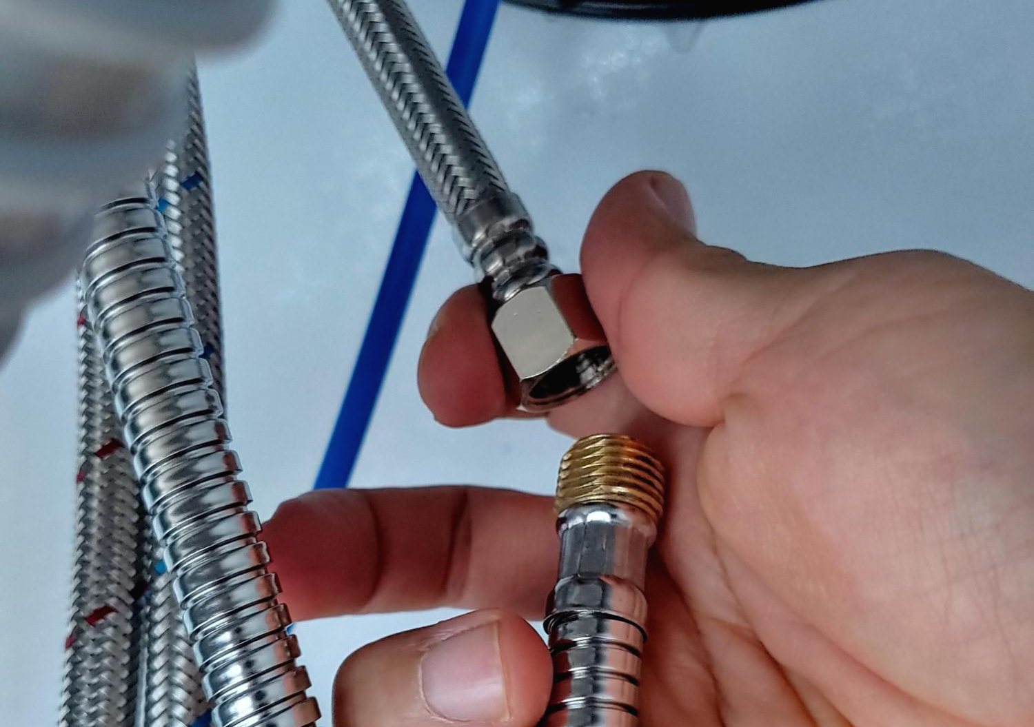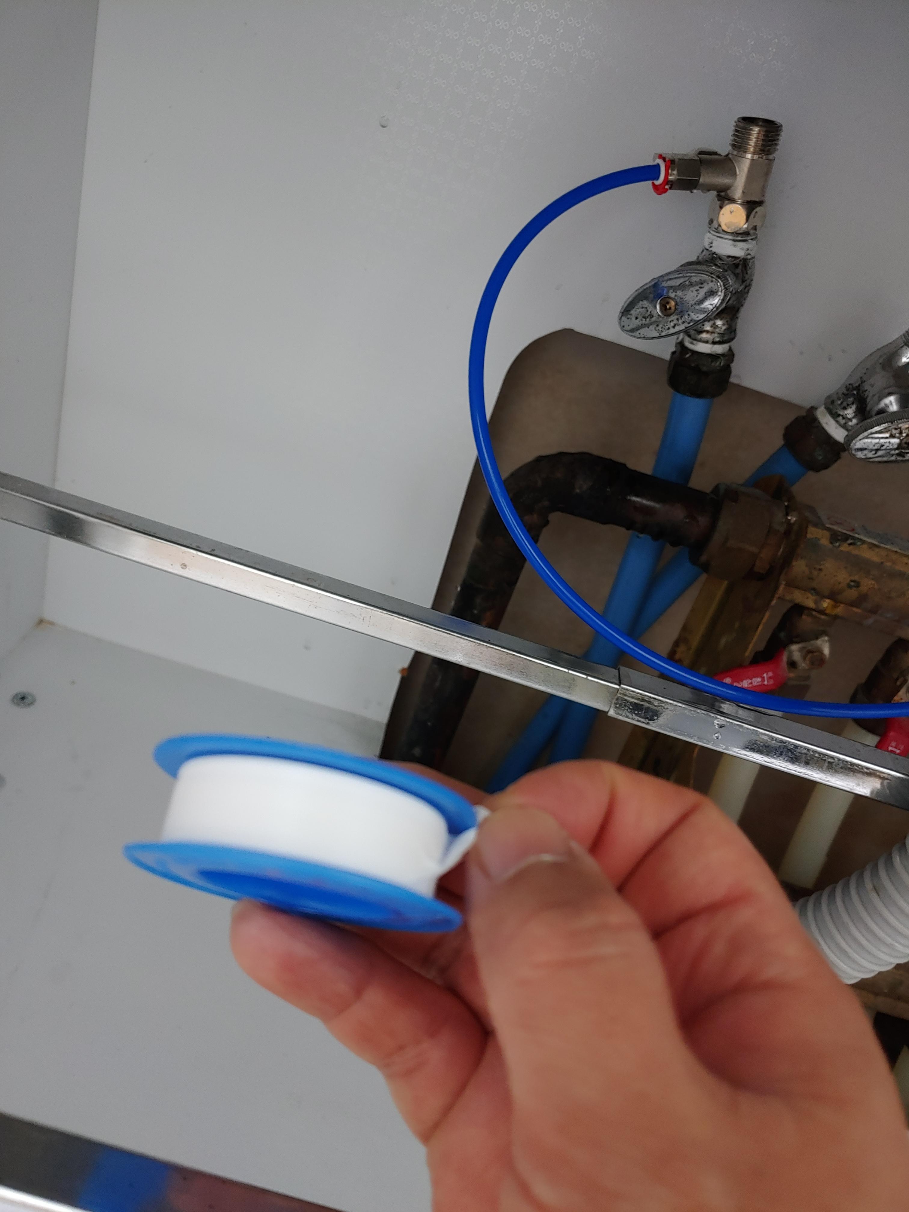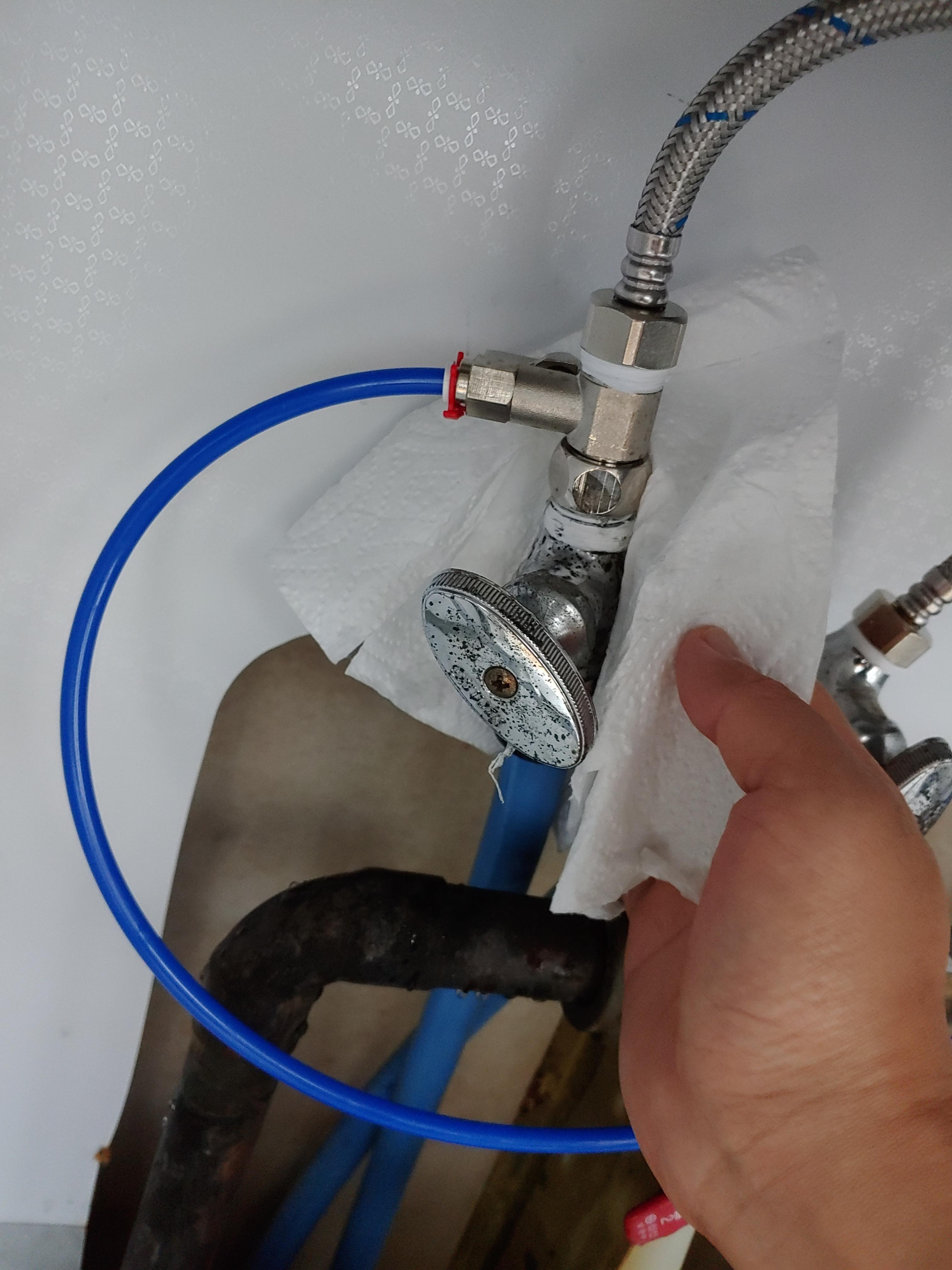 18. 수도밸브를 모두 열고, 물을 틀어 콸콸 나오게 한 다음, 휴지로 물이 새는지 점검합니다.