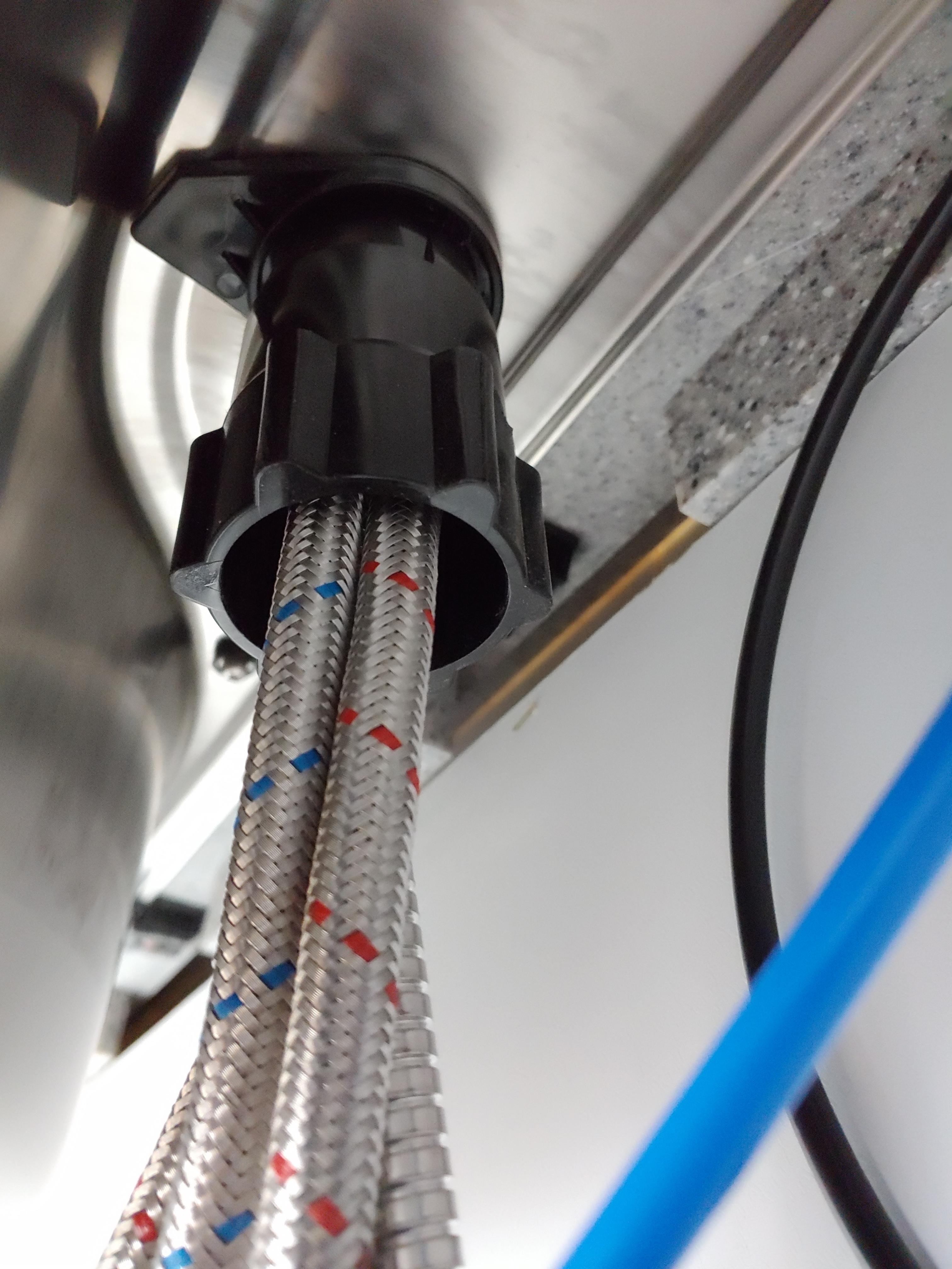 13. 수전몸통 아래쪽, 싱크대 아래에서 고무링, 고정너트 2개를 순서대로 넣어줍니다. 그리고 시계방향으로 바짝 조입니다.