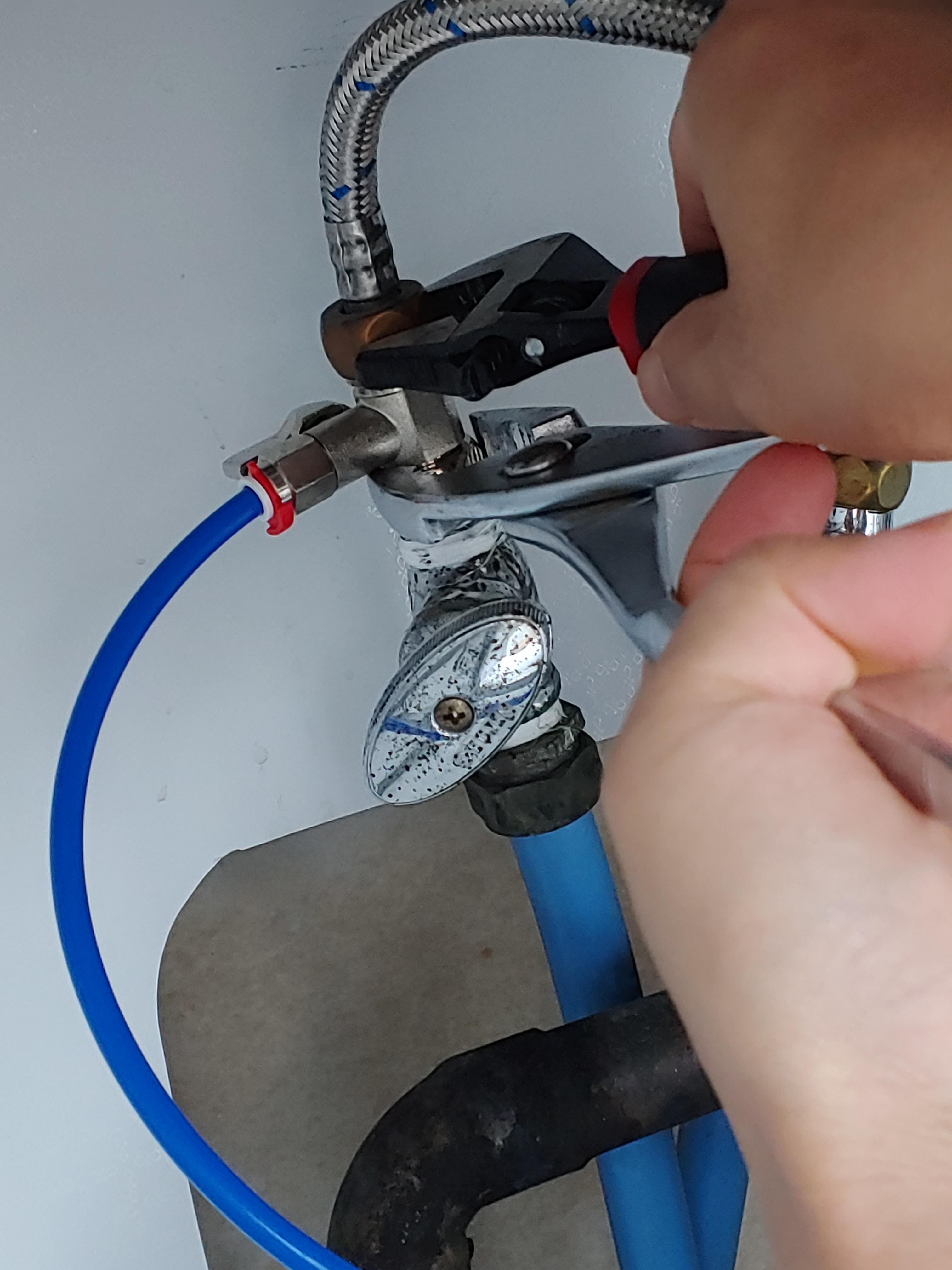 저희집은 정수기가 냉수관에 같이 연결이 되어 있어서 아랫쪽을 잡아주면서 위쪽 너트를 몽키스패너로 풀어주었습니다.