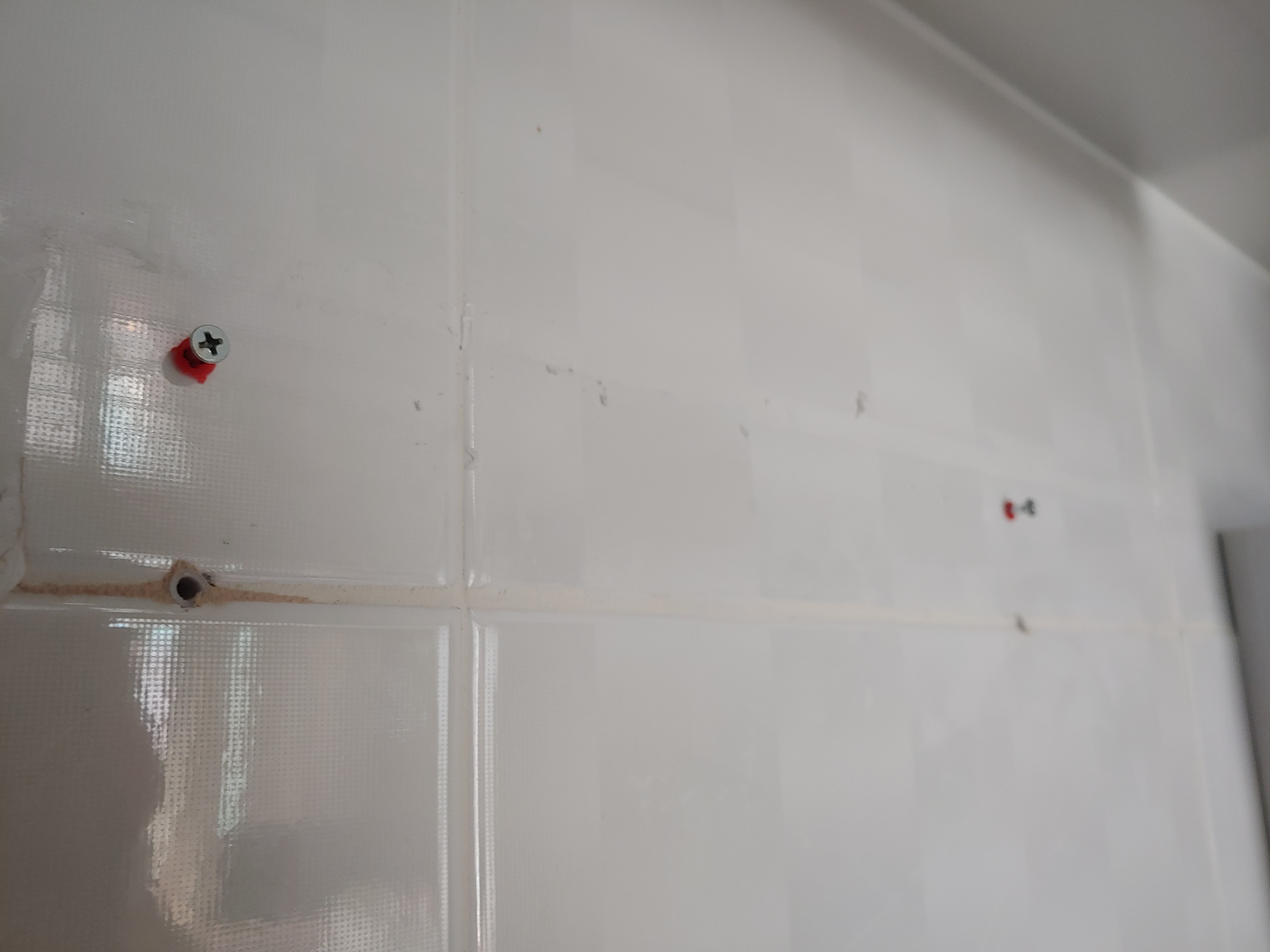 9. 미리 구입해 둔 수납장(600mm)과 거울 위치를 잡아준 다음에 새로 못 구멍을 뚫었습니다.