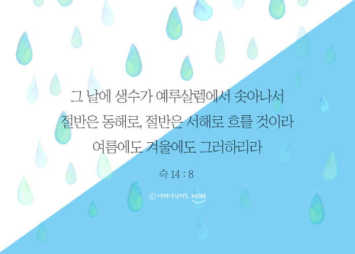 | 스가랴 14장 7~8절 여호와의 아시는 한 날이 있으리니 낮도 아니요 밤도 아니라 어두워 갈 때에 빛이 있으리로다 그 날에 ①생수가 ②예루살렘에서 솟아나서 절반은 동해로, 절반은 서해로 흐를 것이라 여름에도 겨울에도 그러하리라 |