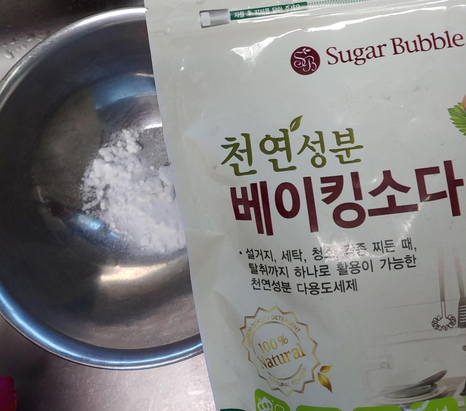 2차 : 베이킹소다 가루를 팍팍 넣고, 키친타올로 박박 닦는다. 그리고 다시 주방세제로 깨끗하게 베이킹소다를 헹구어낸다.