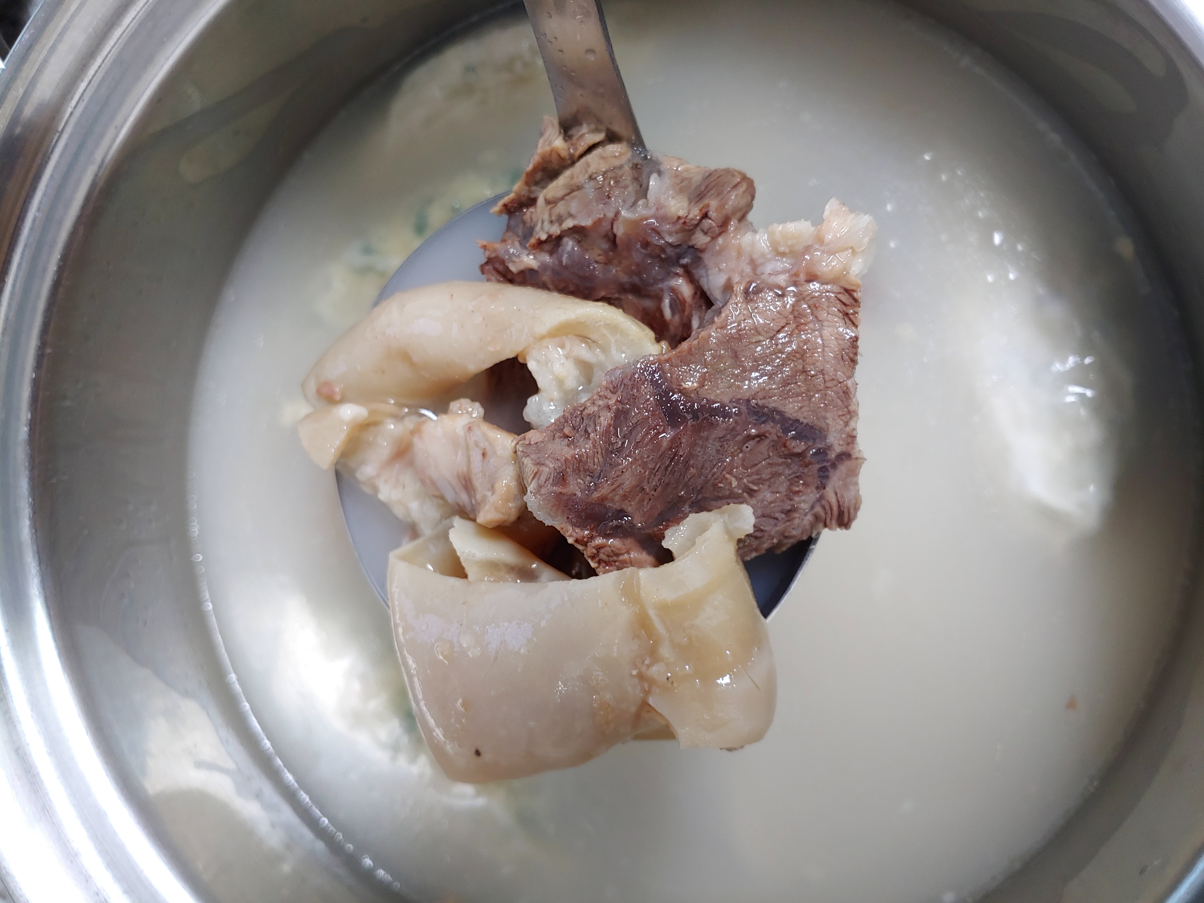 2. 사골을 끓일 때 나온 고기(우족에 붙은 고기와 사태 조금)도 넣습니다.
