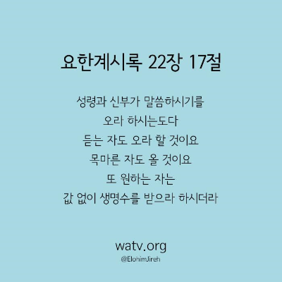 요한계시록 22장 17절 ①성령과 신부가 말씀하시기를 오라 하시는도다 듣는 자도 오라 할 것이요 목마른 자도 올 것이요 또 원하는 값 없이 ②생명수를 받으라 하시더라