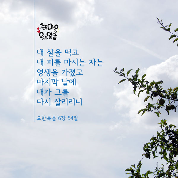 요한복음 6장 53절 예수께서 이르시되 내가 진실로 진실로 너희에게 이르노니 인자의 살을 먹지 아니하고 인자의 피를 마시지 아니하면 너희 속에 생명이 없느니라 내 살을 먹고 내 피를 마시는 자는 영생을 가졌고 마지막 날에 내가 그를 다시 살리리니