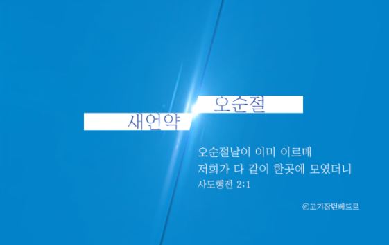 | 사도행전 2장 1절 ①오순절날이 이미 이르매 저희가 다 같이 한곳에 모였더니 홀연히 하늘로부터 급하고 강한 바람 같은 소리가 있어 저희 앉은 온 집에 가득하며 불의 혀 같이 갈라지는 것이 저희에게 보여 각 사람 위에 임하여 있더니 저희가 다 성령의 충만함을 받고 성령이 말하게 하심을 따라 다른 방언으로 말하기를 시작하니라 |