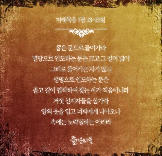 | 마태복음 7:13~15 좁은 문으로 들어가라 ①멸망으로 인도하는 문은 크고 그 길이 넓어 그리로 들어가는 자가 많고 생명으로 인도하는 문은 좁고 길이 협착하여 찾는 이가 적음이니라 ②거짓 선지자들을 삼가라 ③양의 옷을 입고 너희에게 나아오나 ④속에는 노략질하는 이리라 |