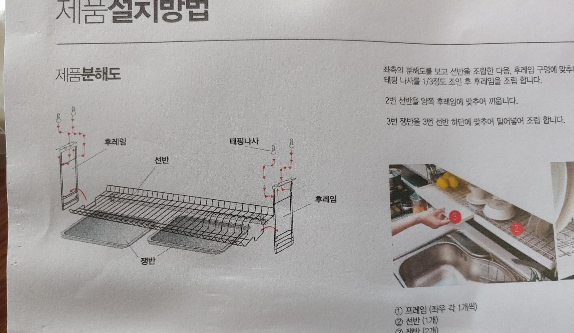 싱크대선반 구입→사용설명서 읽기→나사로 단단하게 박기