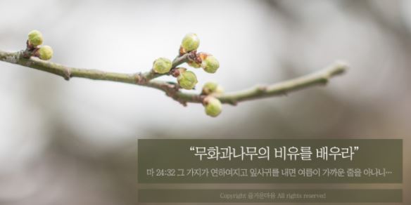 | 마태복음 24장 32~33절 무화과나무의 비유를 배우라 그 가지가 연하여지고 잎사귀를 내면 여름이 가까운 줄을 아나니 이와 같이 너희도 이 모든 일을 보거든 인자가 가까이 곧 문앞에 이른줄 알라 |