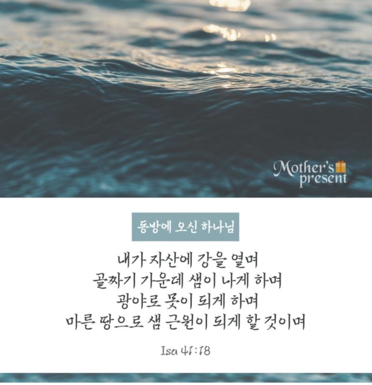 | 이사야 41장 2~18절 누가 ①동방에서 사람을 일으키며 의로 불러서 자기 발 앞에 이르게 하였느뇨 ②열국으로 그 앞에 굴복케 하며 그로 왕들을 치리하게 하되 그들로 그의 칼에 티끌 같게, 그의 활에 불리는 초개 같에 하매 그가 그들을 쫓아서 그 발로 가 보지 못한 길을 안전히 지났나니 이 일을 누가 행하였느냐 누가 이루었느냐 누가 태초부터 만대를 명정하였느냐 나 여호와라 태초에도 나요 나중 있을 자에게도 내가 곧 그니라 (중략) ③가련하고 빈핍한 자가 물을 구하되 물이 없어서 갈증으로 그들의 혀가 마를 때에 나 여호와가 그들에게 응답하겠고 나 이스라엘의 하나님이 그들을 버리지 아니할 것이라 ④내가 자산에 강을 열며 골짜기 가운데 샘이 나게 하며 광야로 못이 되게 하며 ⑤마른 땅으로 샘 근원이 되게 할 것이며 |