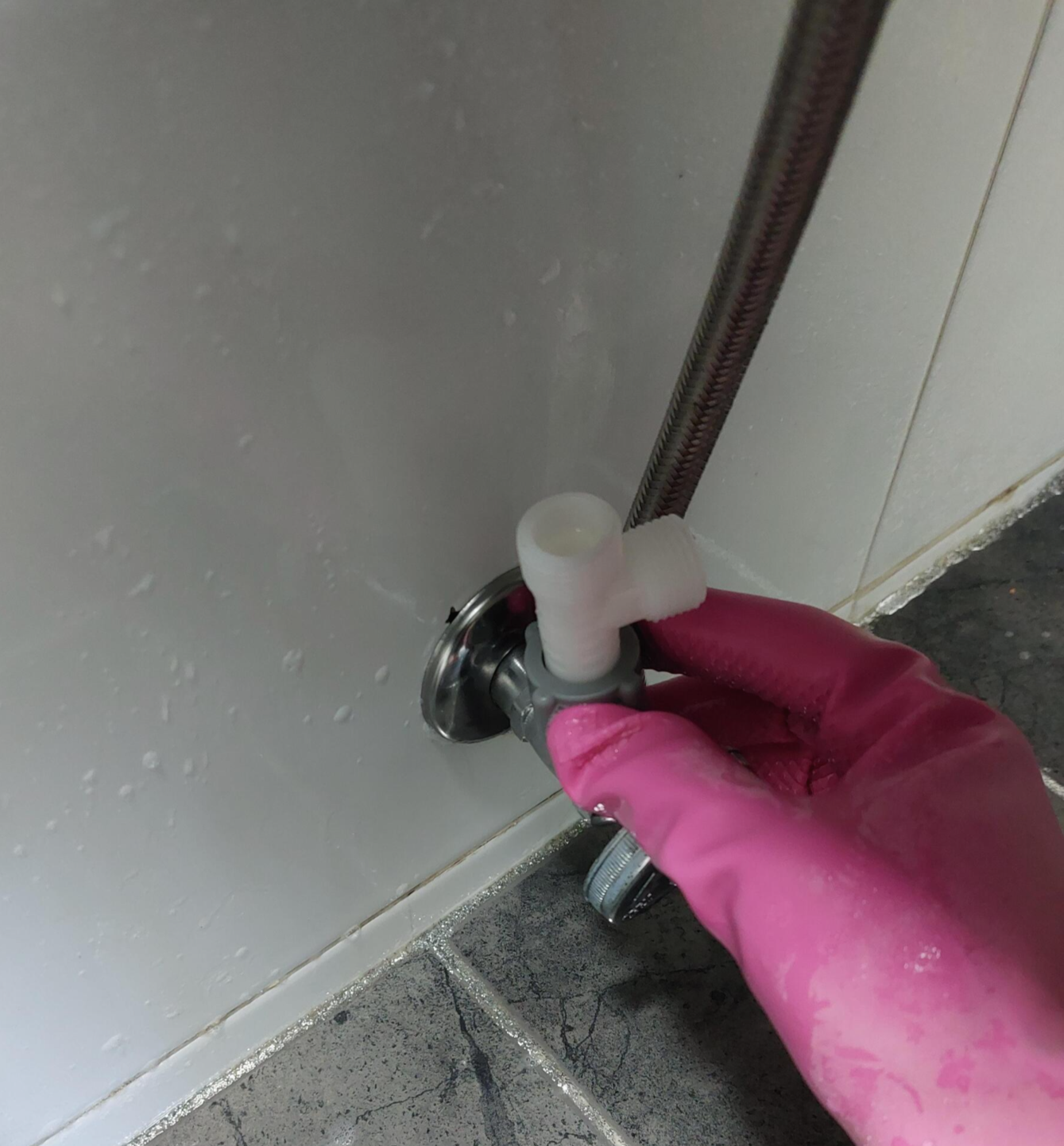 4. 이제 물 호스관을 연결해야 하겠죠? 가장 먼저 변기 아래쪽에 변기와 연결된 수도관을 잠궈줍니다.