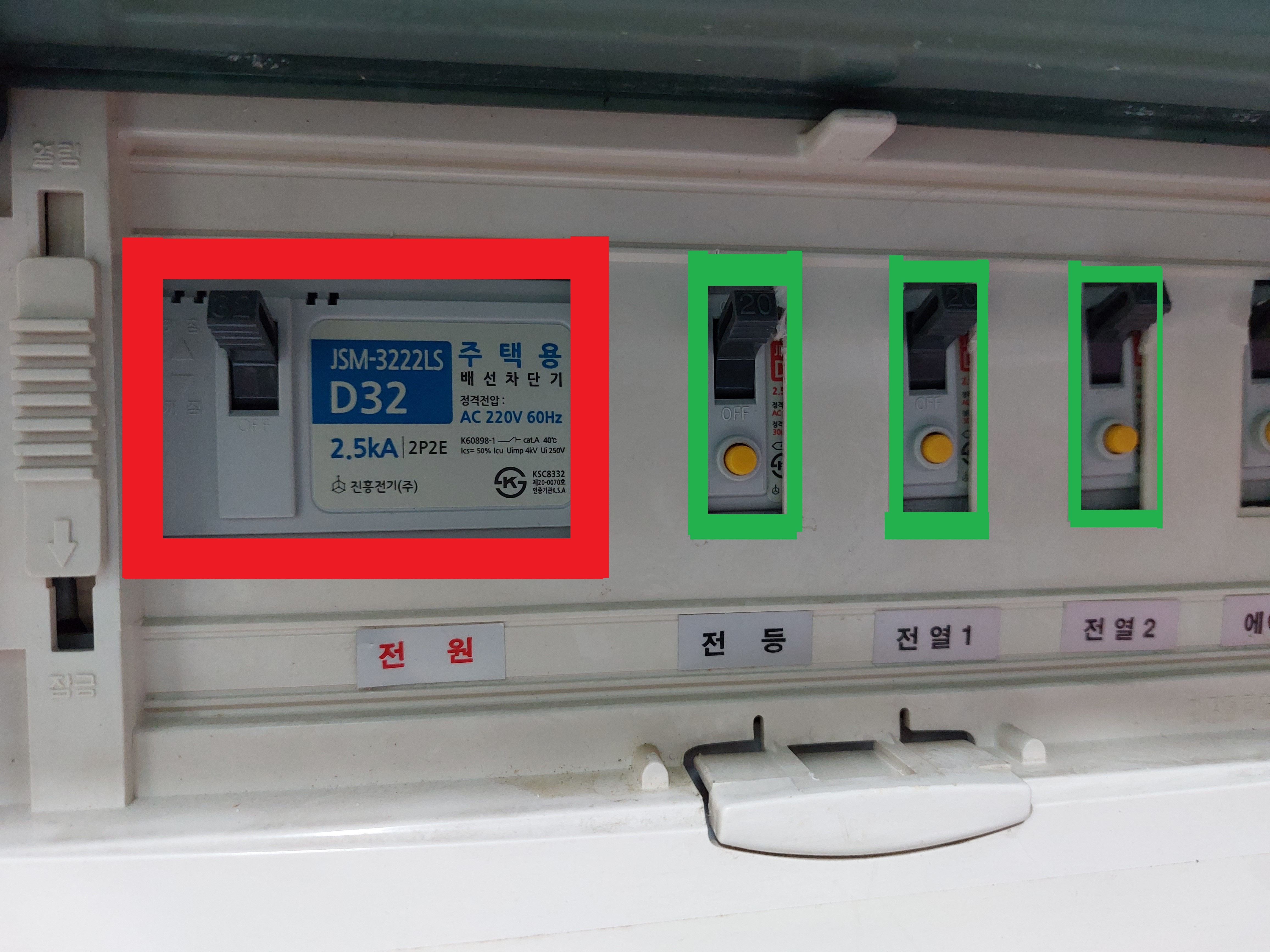 아래 사진에서 빨간색 전체 전원을 딱 내려주면 됩니다. 혹 가정에서 어떤 전기를 꼭 써야 된다면 초록색 표시한 차단기를 하나씩 내려보면 내가 작업할 곳으로 가는 전기배선만 차단할 수 있습니다.