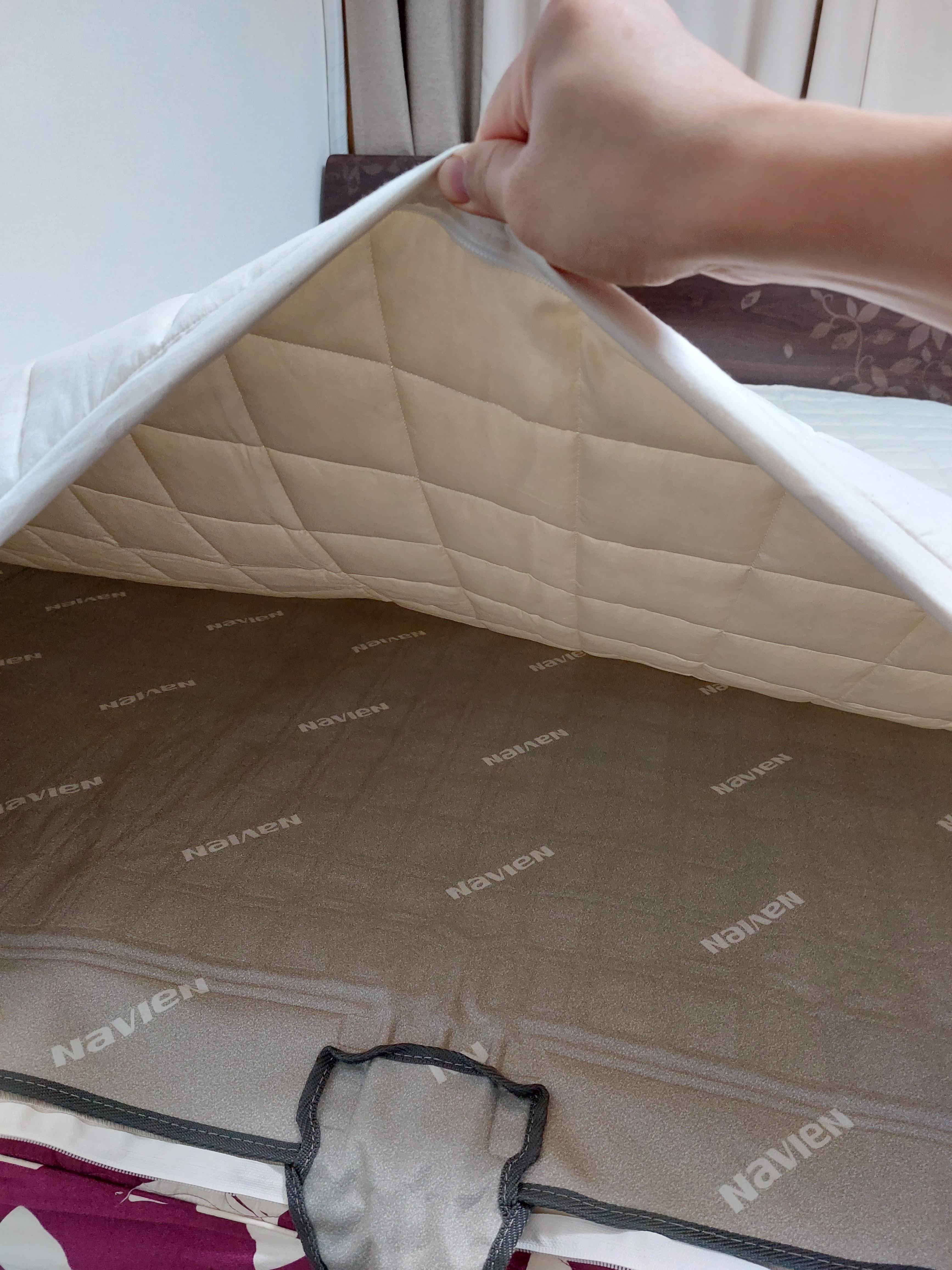 커버가 따로 옵니다. 커버 안에 온수매트를 집어 넣습니다. 커버 색깔은 아이보리네요. 582모델은 다크그레이 색깔이라고 하네요. 그리고 커버 안쪽에 끈이 있어서 커버와 매트를 서로 묶어서 고정시킬 수 있습니다.