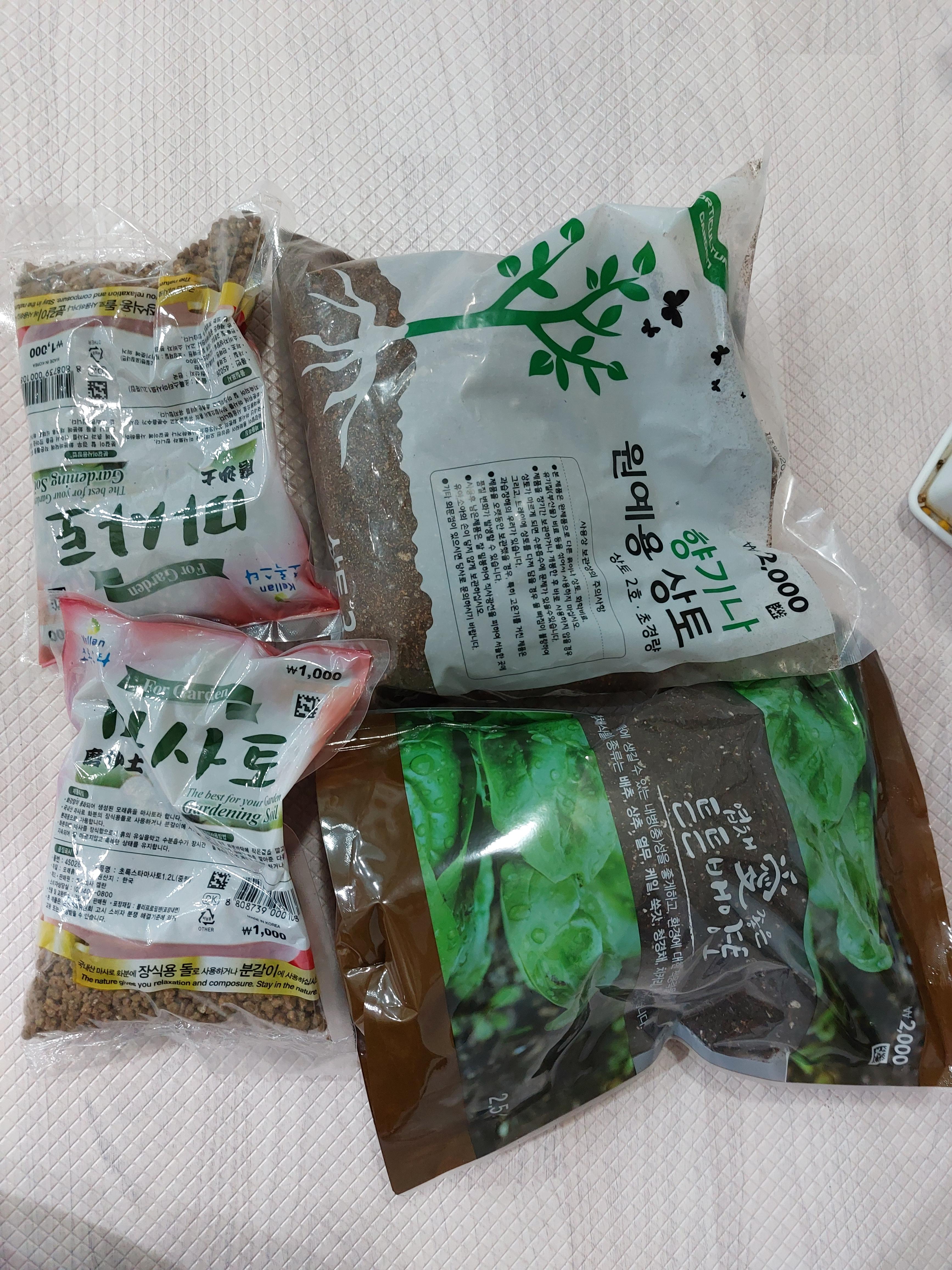 몬스테라도 심고, 그 외에 다른 식물도 옮겨 심을 겸, 화분과 흙, 마사토 등을 사왔습니다. 다이소에 갔더니 화분은 작은건 2천원, 중간크기 3천원. 흙은 2천원, 마사토는 1천원이네요.