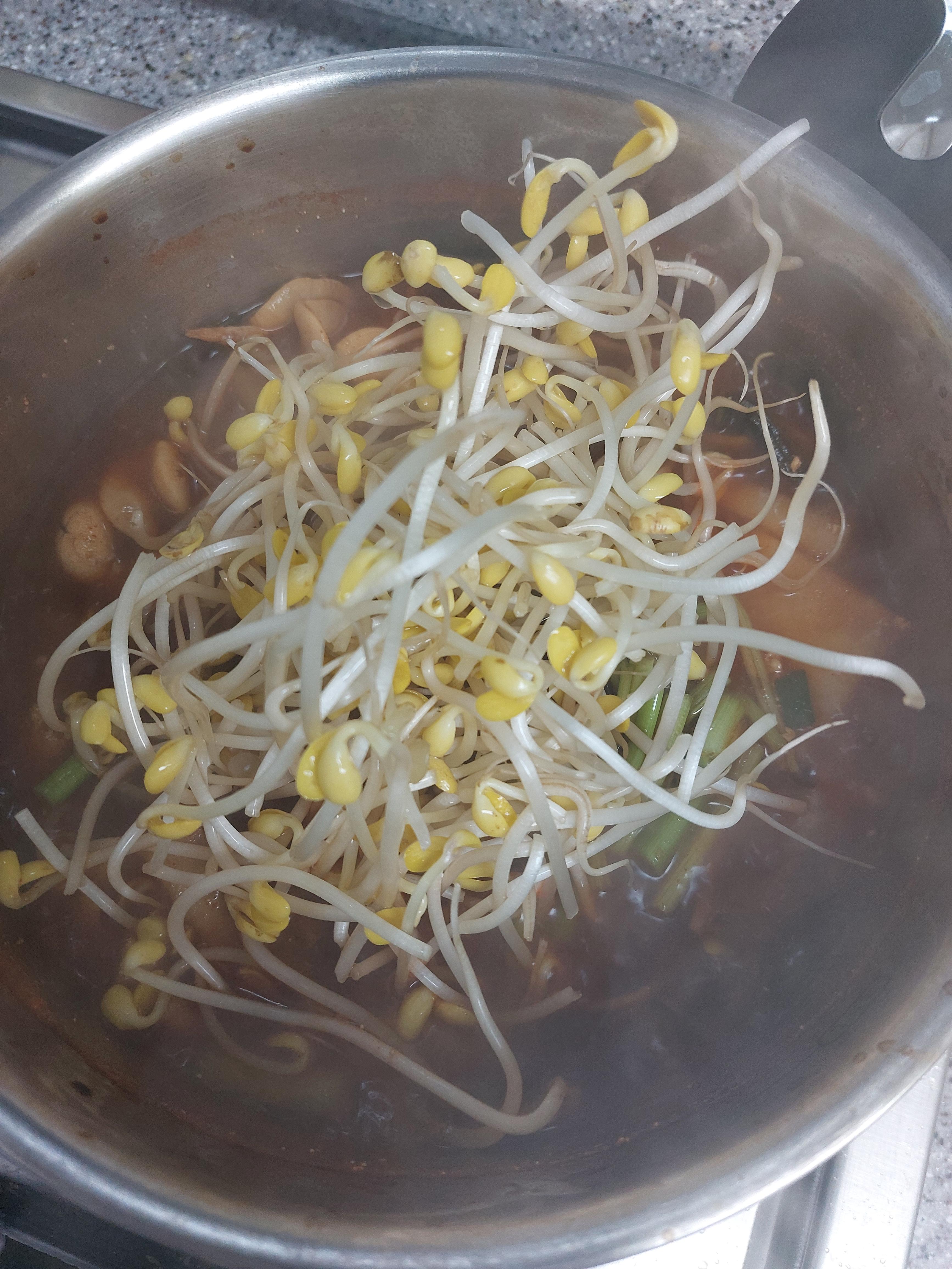 맨 마지막에 콩나물, 미나리, 감자수제비를 넣고 팔팔 끓입니다.