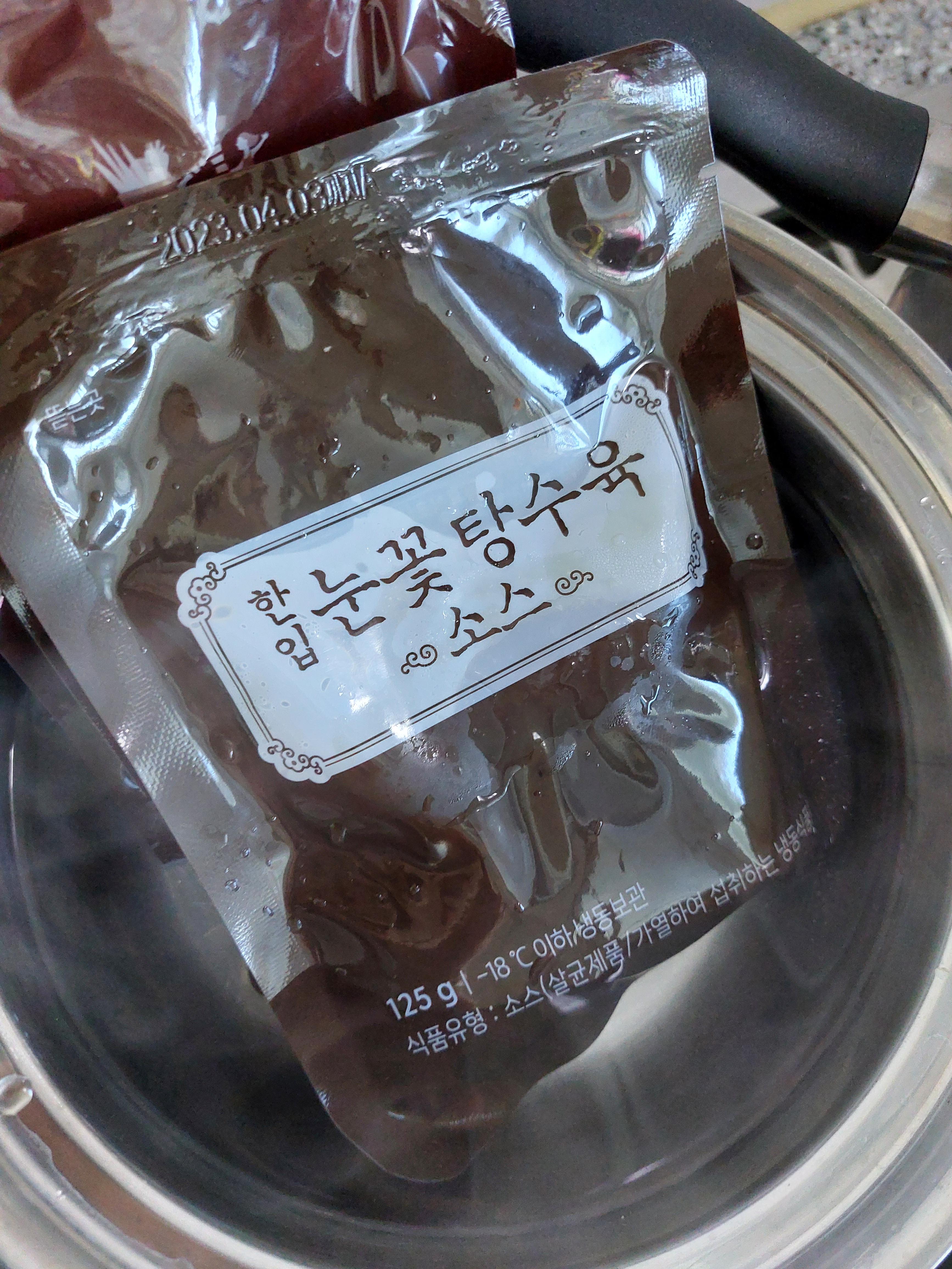설명서에 나온대로 기름에 튀깁니다. 소스는 뜨거운 물에 녹입니다.