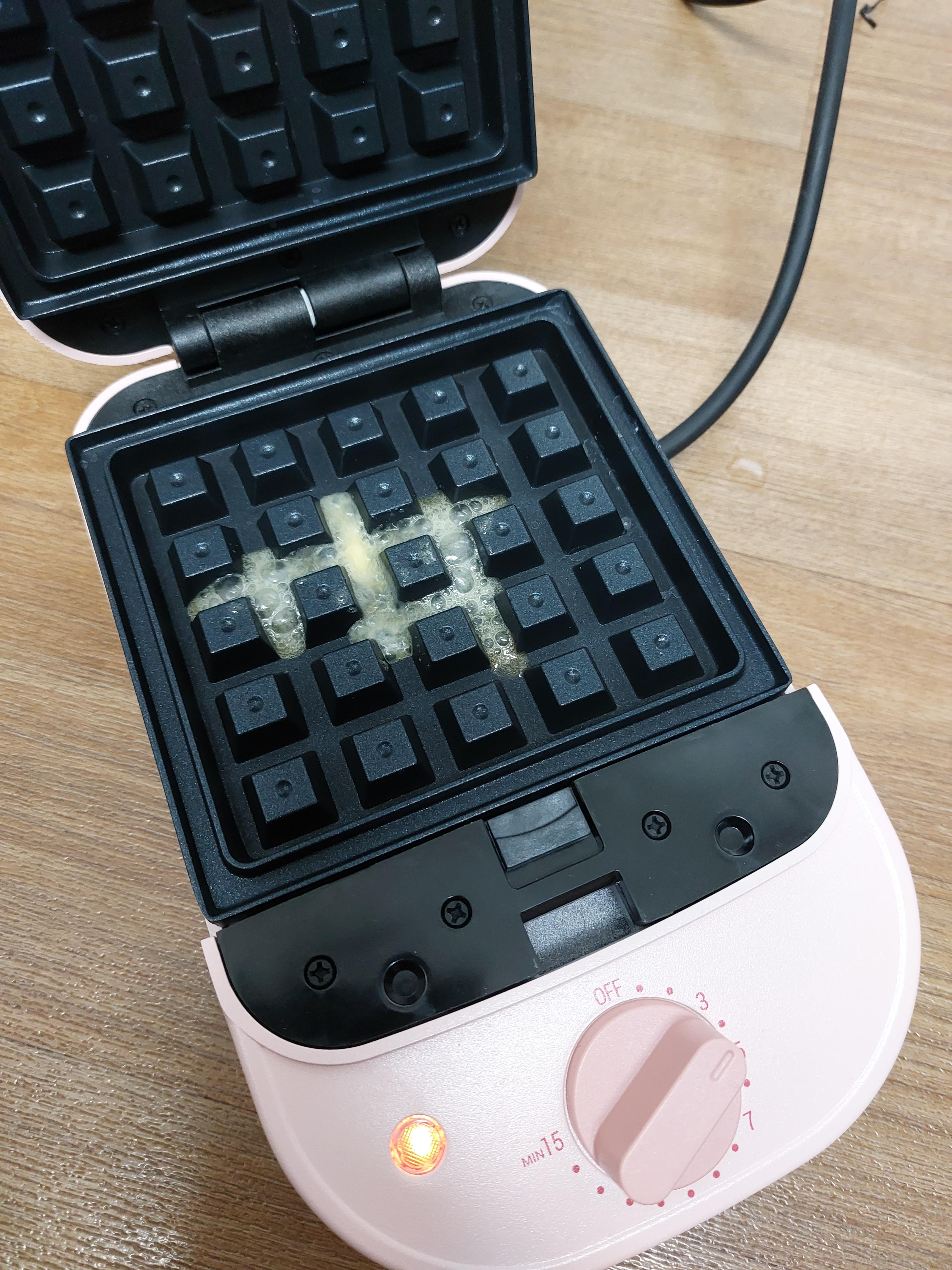 1. 버터나 식용유를 발라도 되고 안 해도 됩니다. 고소함을 위해서 와플팬에 버터를 살짝 녹였습니다.