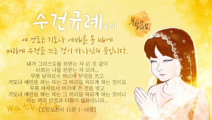 오늘날의 **교는 여성도들이 머리에 아무 것도 쓰지 않은 채 예배를 드립니다. 그리고 오늘날의 **교는 남자가 머리에 뭔가를 쓰고 미사를 집전합니다. 수건규례조차 교묘하게 변개시킨 곳에 과연 하나님이 계실까요? 성경대로 행하는 것이 단 하나도 없는 오늘날의 종교계를 보면 정말 마음이 씁쓸합니다.