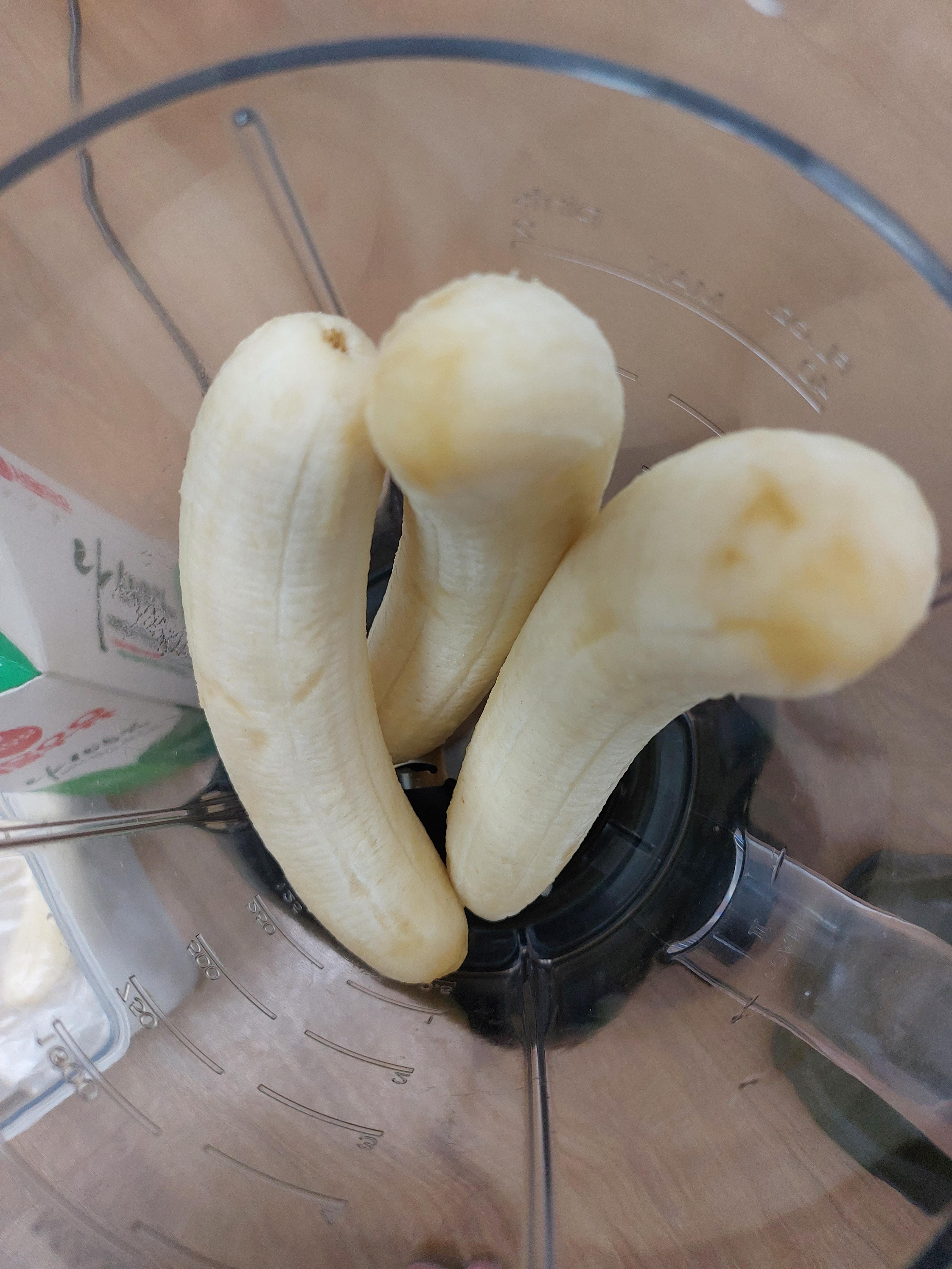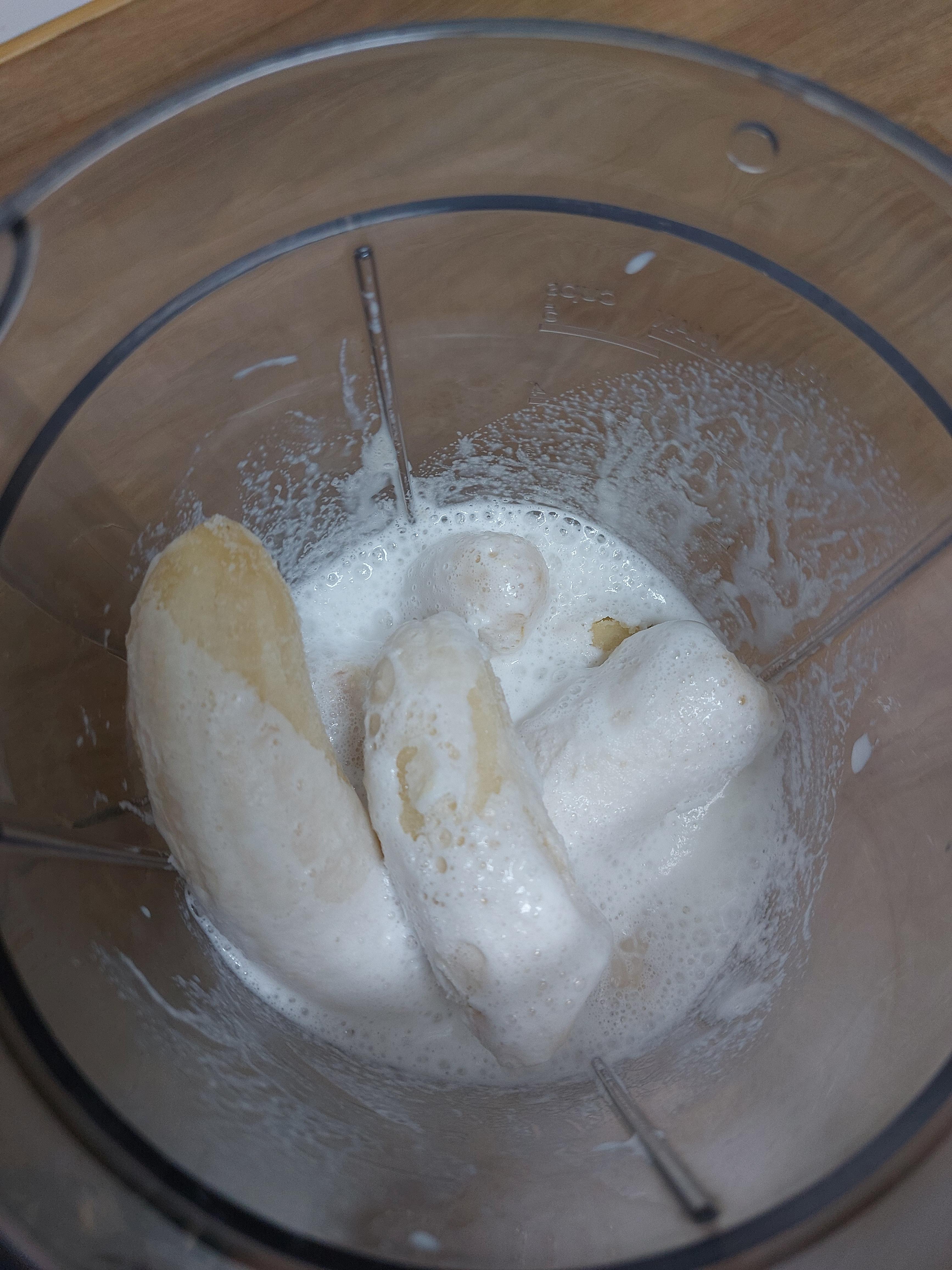 얼린 바나나를 꺼내서, 믹서기에 넣어요. 우유를 적당히 부어줍니다.