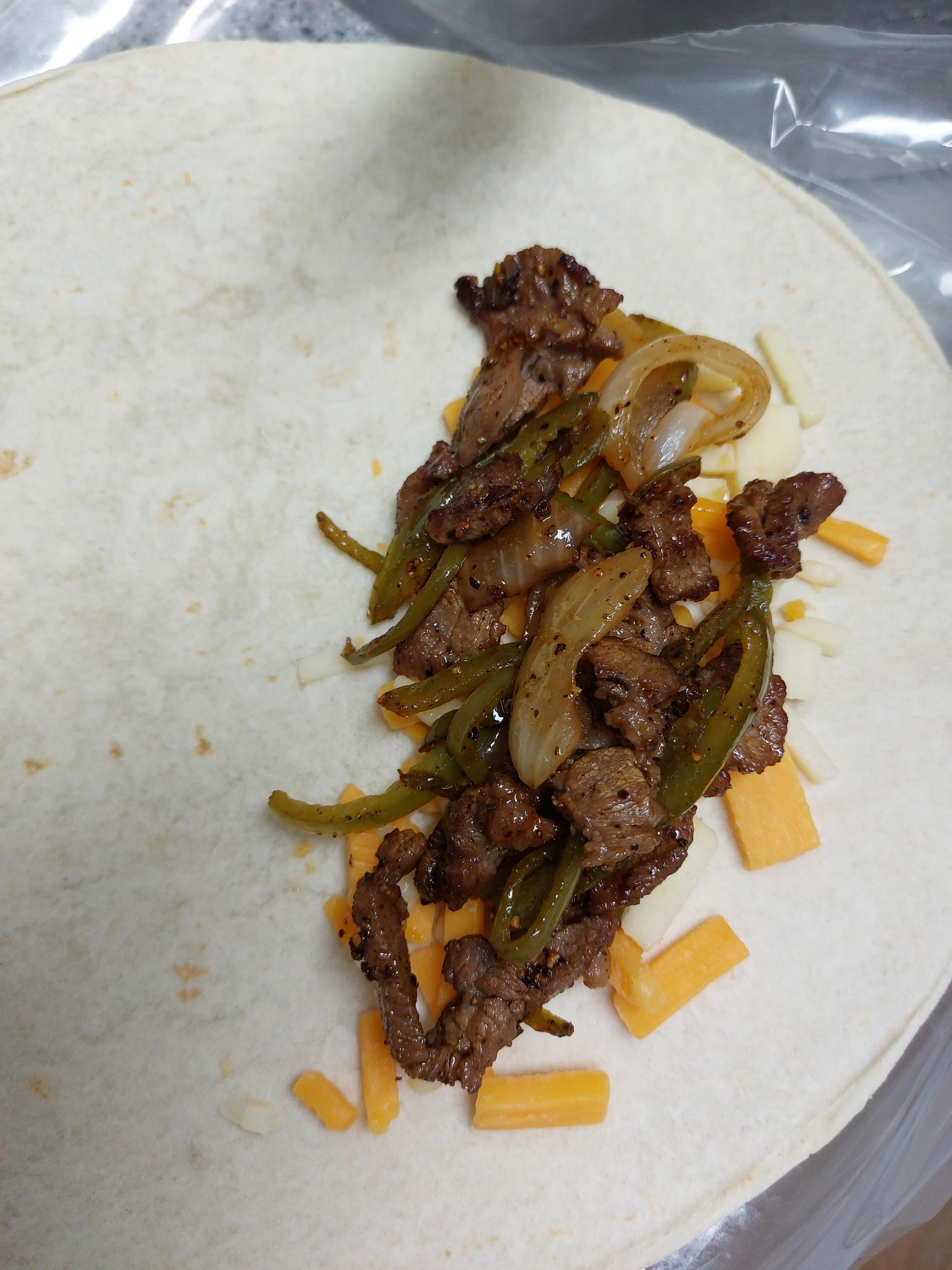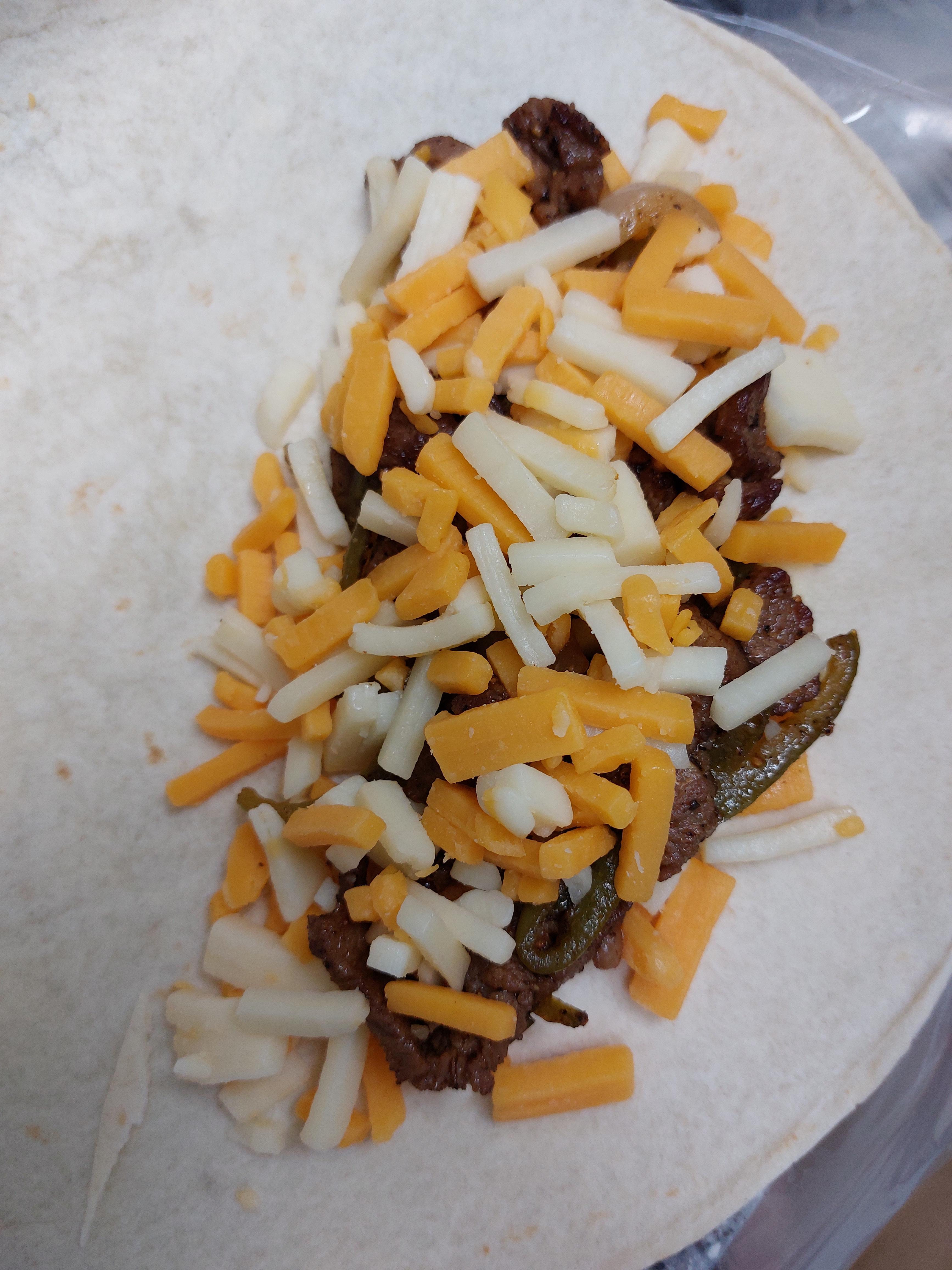 4. 또띠아를 깔고. 볶은 고기를 반 넣고, 치즈 가루를 올려요.