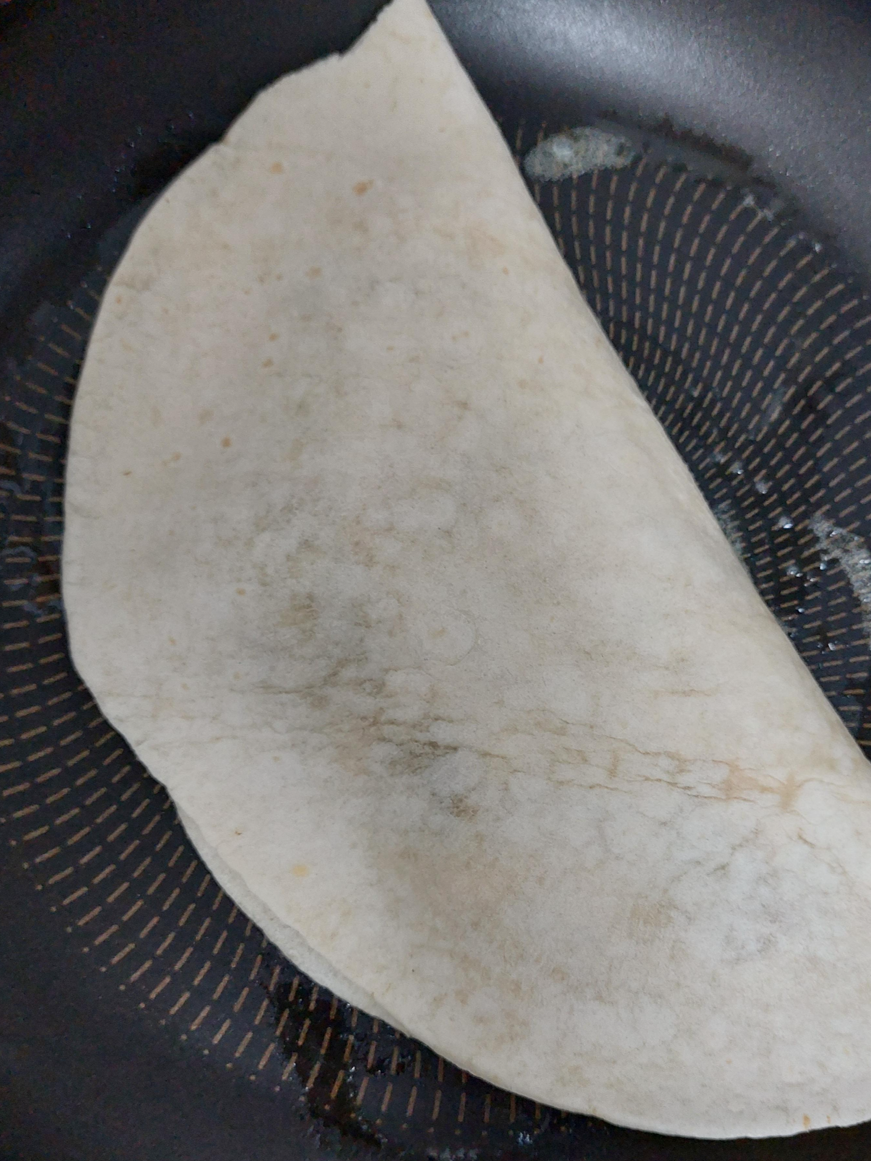 5. 팬을 중불로 예열후, 버터 1개를 놓인 뒤, 위에서 방금 만든 케사디아를 팬에 올려 약한 불로 2분간 앞뒤로 노릇노릇하게 구워요.