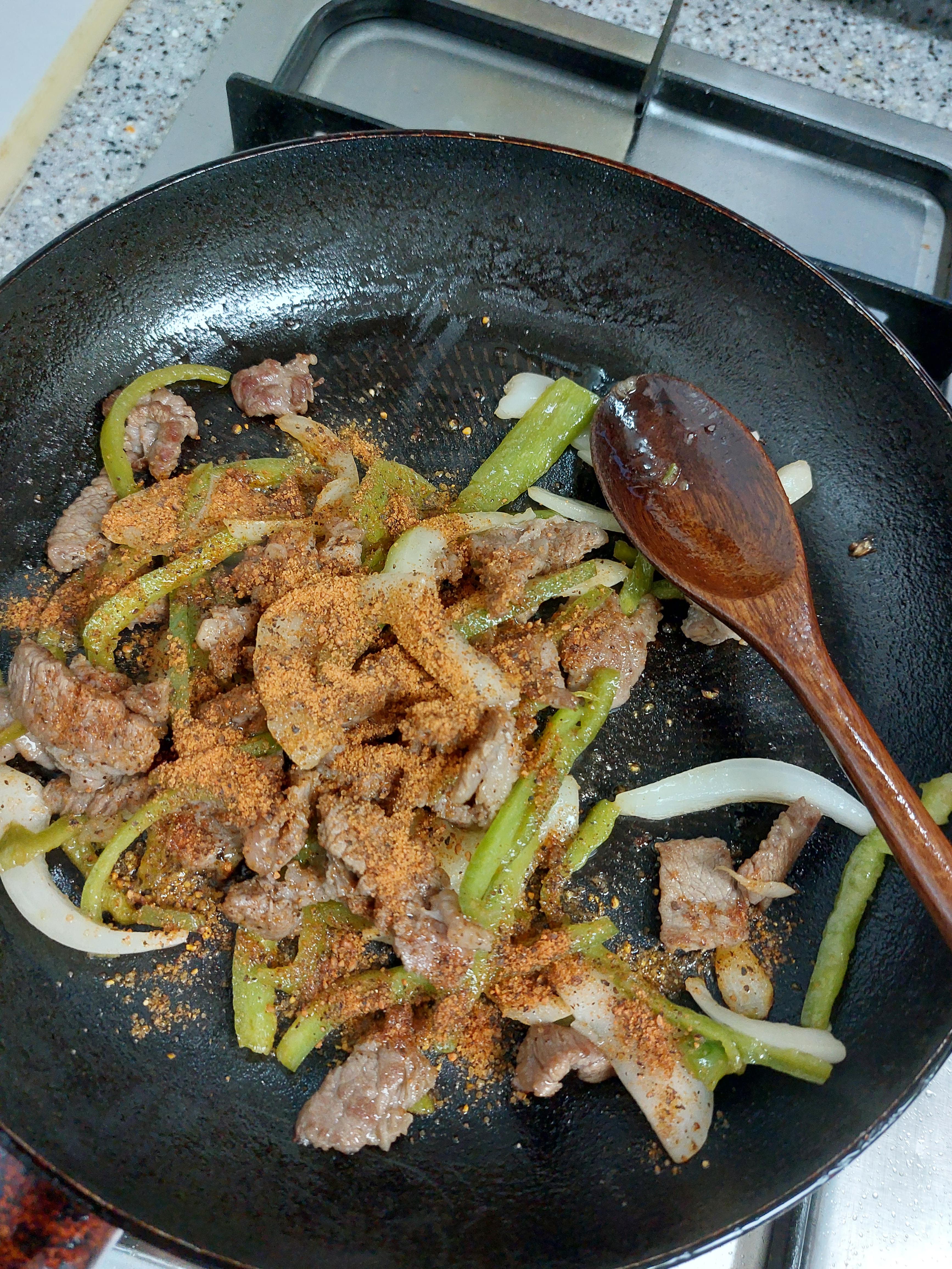 3. 고기를 볶아요 → 그리고 야채를 넣고 볶아요. → 칠리 시즈닝을 넣고 볶아요.