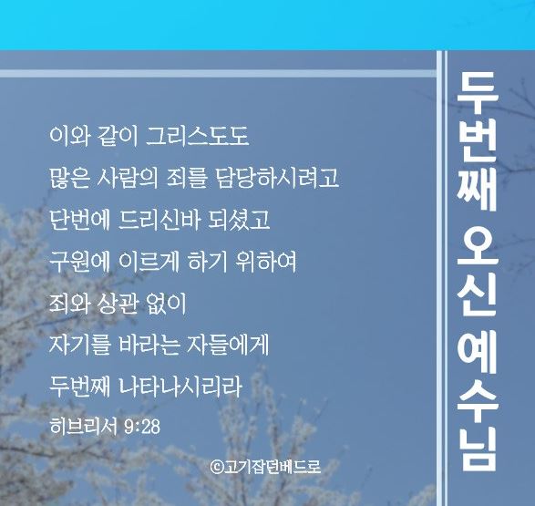 | 히 9:28 이와 같이 그리스도도 많은 사람의 죄를 담당하시려고 단번에 드리신바 되셨고 구원에 이르게 하기 위하여 죄와 상관 없이 자기를 바라는 자들에게 두번째 나타나시리라 |