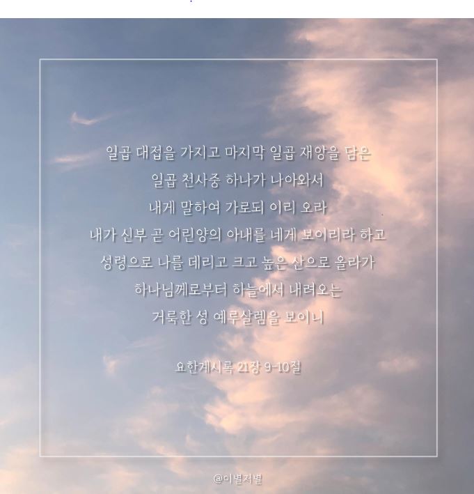 | 계 19:7~9 우리가 즐거워하고 크게 기뻐하여 그에게 영광을 돌리세 어린 양의 혼인 기약이 이르렀고 그 아내가 예비하였으니 그에게 허락하사 빛나고 깨끗한 세마포를 입게 하셨은즉 이 세마포는 성도들의 옳은 행실이라도 하더라 천사가 내게 말하기를 기록하라 어린 양의 혼인 잔치에 청함을 입은 자들이 복이 있도다 하고 계 21:9~10 일곱 대접을 가지고 마지막 일곱 재앙을 담은 일곱 천사 중 하나가 나아와서 내게 말하여 가로되 이리 오라 내가 신부 곧 어린 양의 아내를 네게 보이리라 하고 성령으로 나를 데리고 크고 높은 산으로 올라가 하나님께로부터 하늘에서 내려오는 거룩한 성 예루살렘을 보이니 갈 4:26 오직 위에 있는 예루살렘은 자유자니 곧 우리 어머니라 |