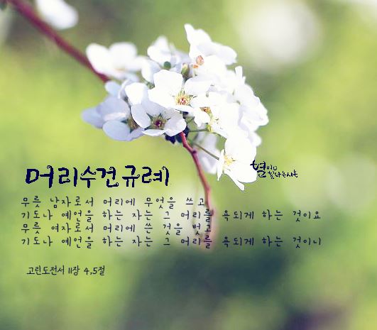 | 고전 11:4~5 무릇 ①남자로서 머리에 무엇을 쓰고 기도나 예언을 하는 자는 그 머리를 욕되게 하는 것이요 무릇 ②여자로서 머리에 쓴 것을 벗고 기도나 예언을 하는 자는 그 머리를 욕되게 하는 것이니 이는 머리 민것과 다름이 없음이니라 |