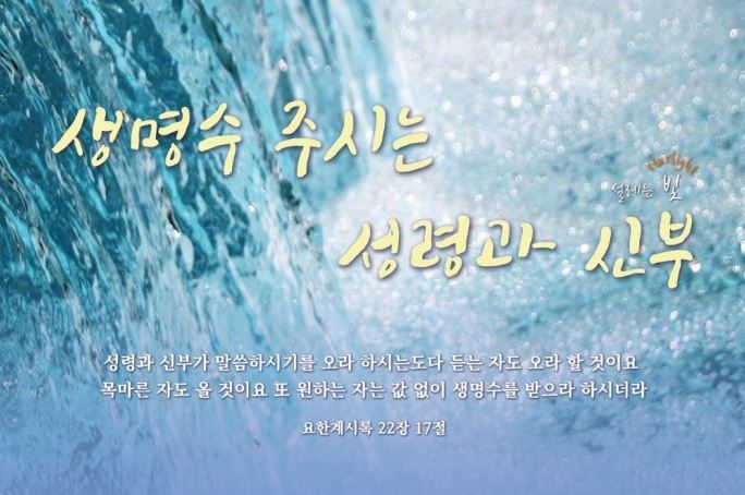 성령과 신부께서 나타나십니다. 성령과 신부께서 생명수를 주십니다. 여기서 "신부"는 우리들에게 생명수를 주시는 하나님이십니다.