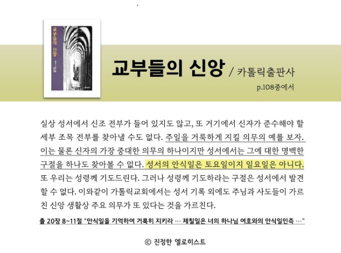 마지막으로 첨부한 사진을 보시면, 카톨릭에서 출판한 책자에서도 성서의 안식일이 토요일임을 밝히고 있으며, 일요일 예배에 대한 성서의 기록은 단 하나도 찾아볼 수 없다고 말하고 있습니다.