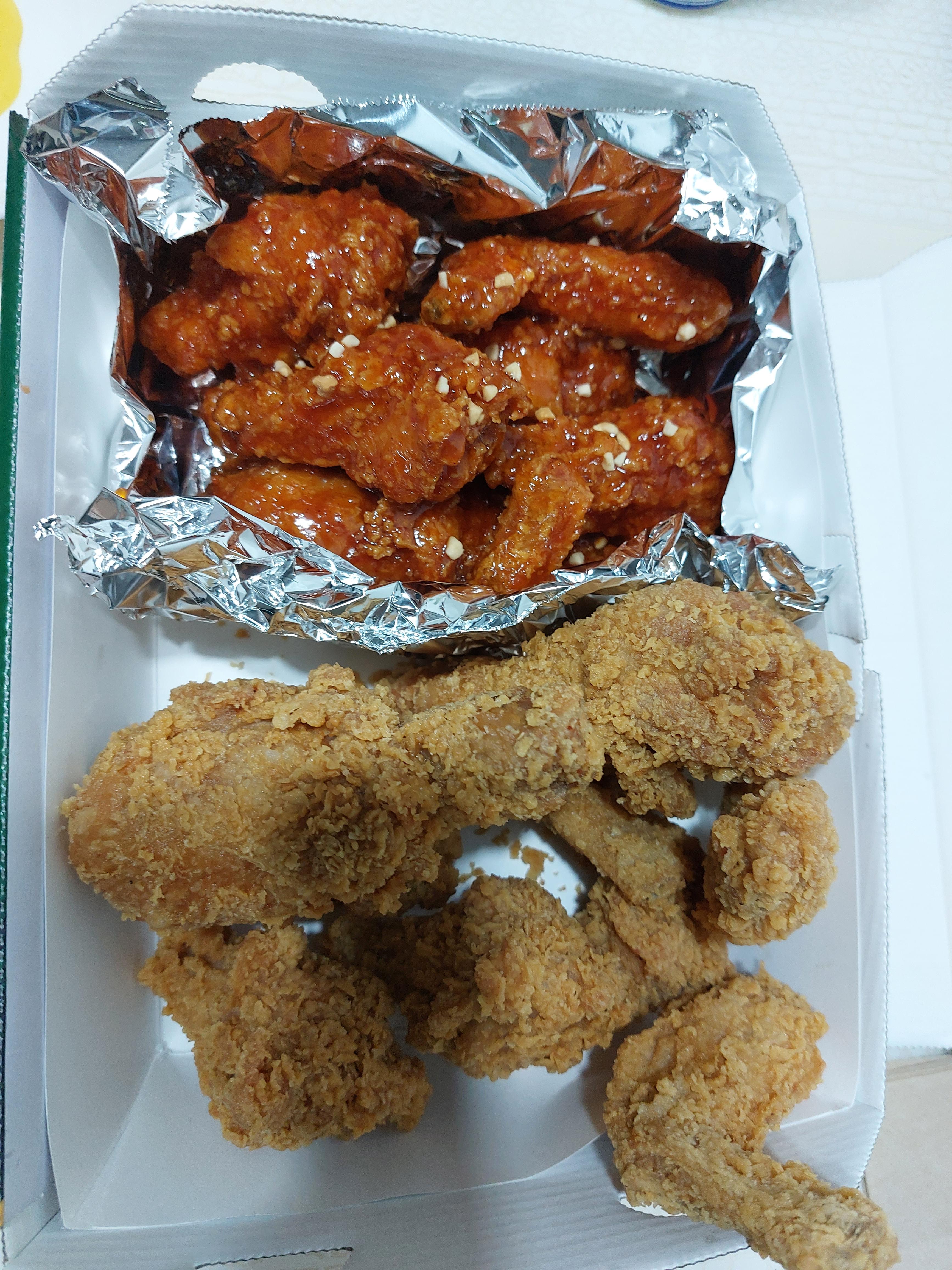 양념, 후라이드 반반으로 윙,봉,닭다리가 오네요