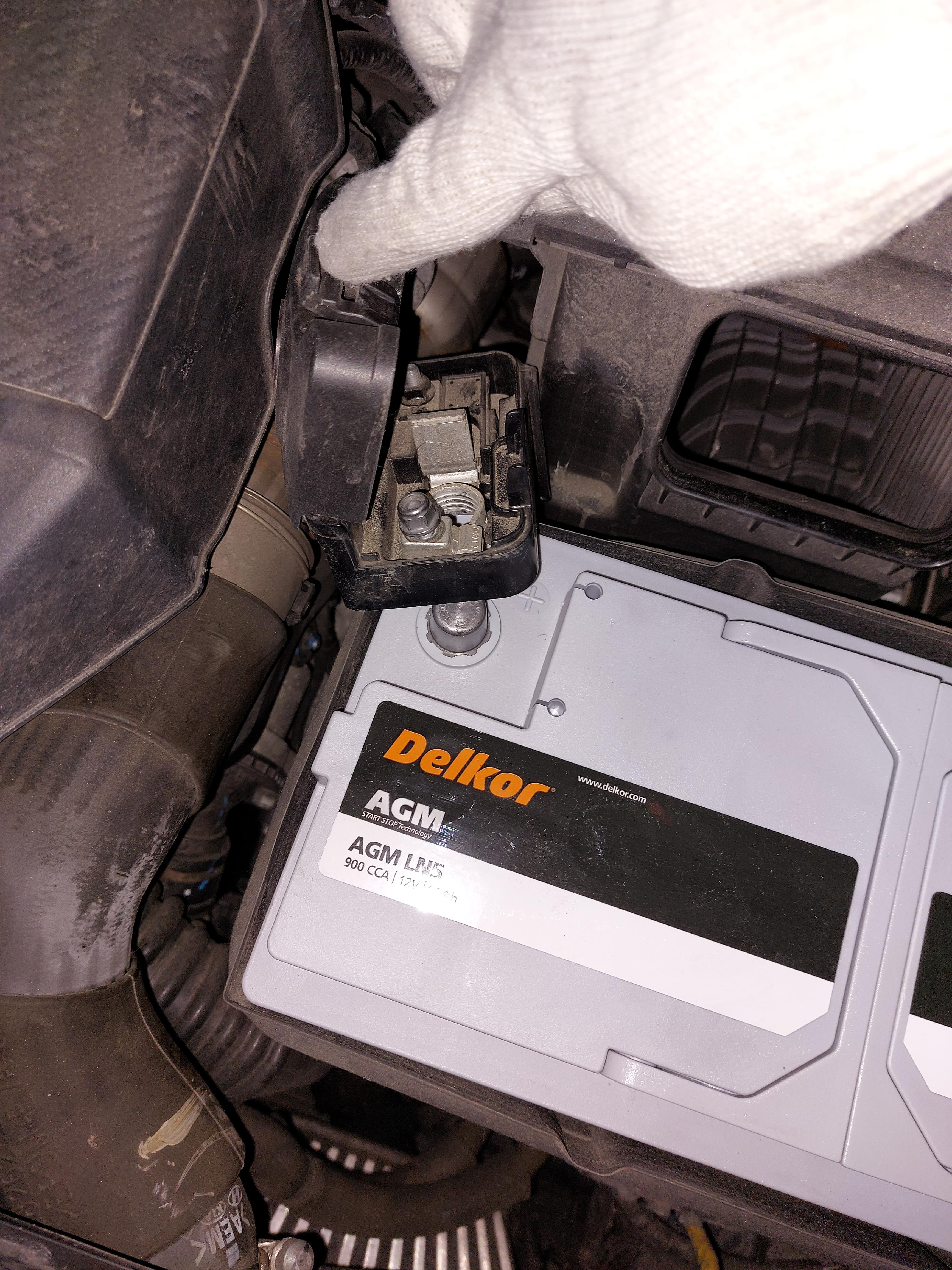 14. 플러스 단자 연결합니다. 새 배터리에 있던 보호캡을 빼고, 연결하면 됩니다.