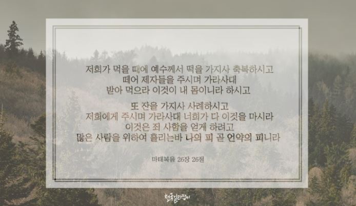 마태복음 26장 28절 (유월절) 이것은 죄 사함을 얻게 하려고 많은 사람을 위하여 흘리는바 나의 피 곧 언약의 피니라