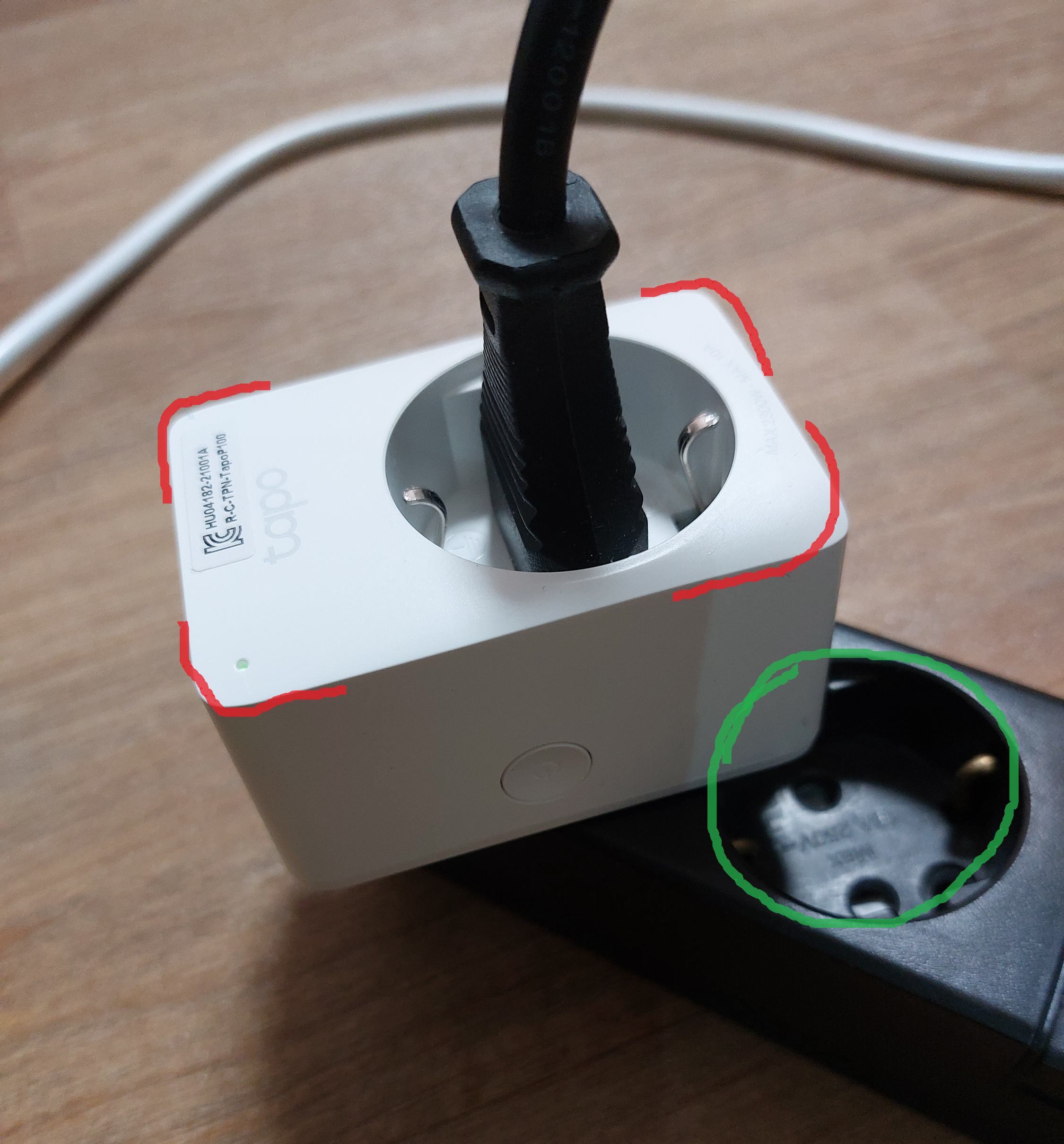 아! 단점이 딱 하나 있어요. 제품이 직육면체 모양인데, 2구, 3구 콘센트에 꽂으면, 바로 옆 칸 콘센트 영역을 침범해서 한 칸을 사용하지 못한다는 단점이 있더라고요. 아래 사진에서 초록색으로 동그라미한 콘센트 위치를 사용하지 못하더라고요. 두 칸을 차지한다는 점이에요.